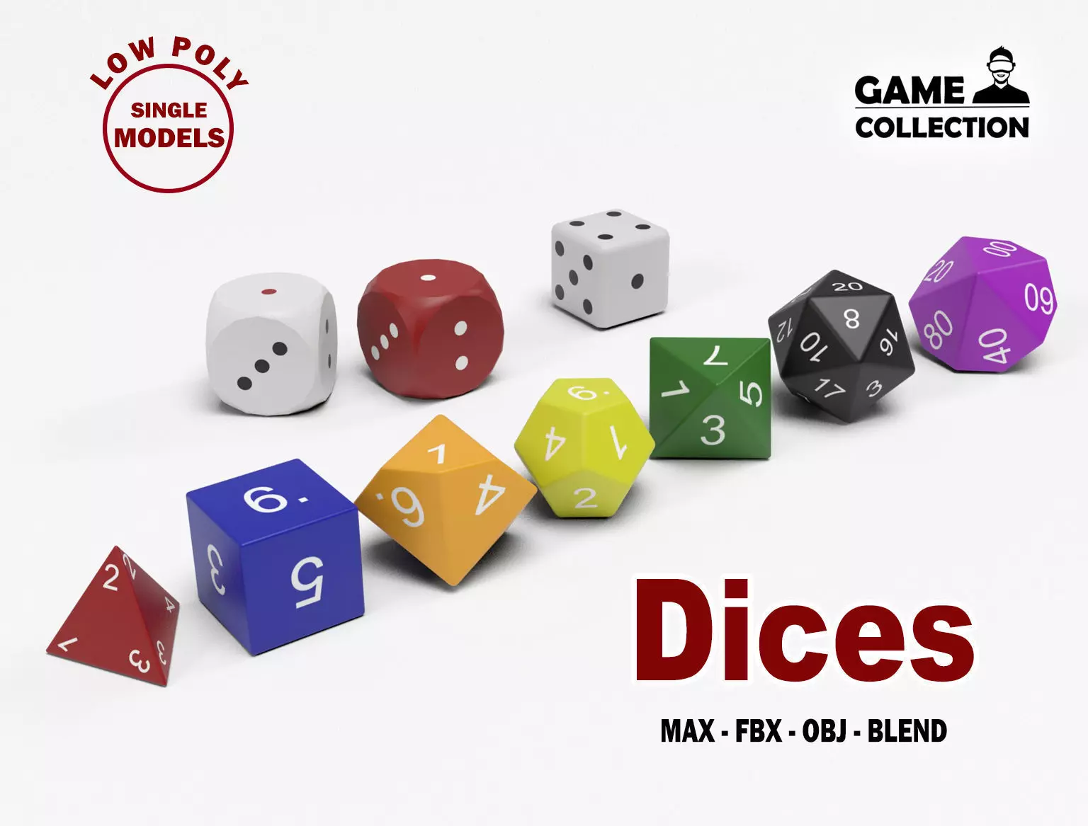 3D models of a collection of 10 dices that go from sides to 20 with different colours. Normal dices and dices for rol games. The models has been created with 3D Studio Max 2022 and Blender 2.93. All the models are low poly, basic but realistic and are ideal for 3D scenes that require few polygons. They can be used for advertising visualitations and also for games or applications. It has been created in different 3D Studio Max versions and also in FBX, OBJ and blend.