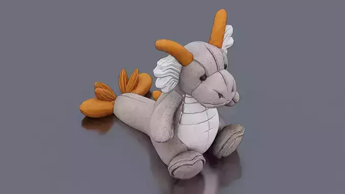 This low-poly 3D model depicts a plush dragon toy. With a soft, fabric-textured body, it features a mix of mythical elements: a gray dragon head with orange horns, wing-like appendages, and a fish-tail rear. The design blends fantasy creature traits with the cozy, huggable appeal of a stuffed toy, rendered in a simplified, polygonal style ideal for real-time applications or stylized 3D art.