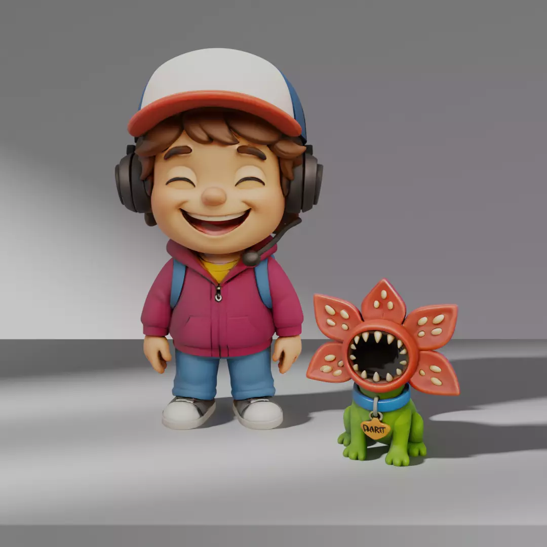 This product features a stylized 3D duo inspired by characters from a popular supernatural adventure series: a cheerful boy wearing his iconic cap and headset, accompanied by his small creature companion with a flower-shaped mouth.