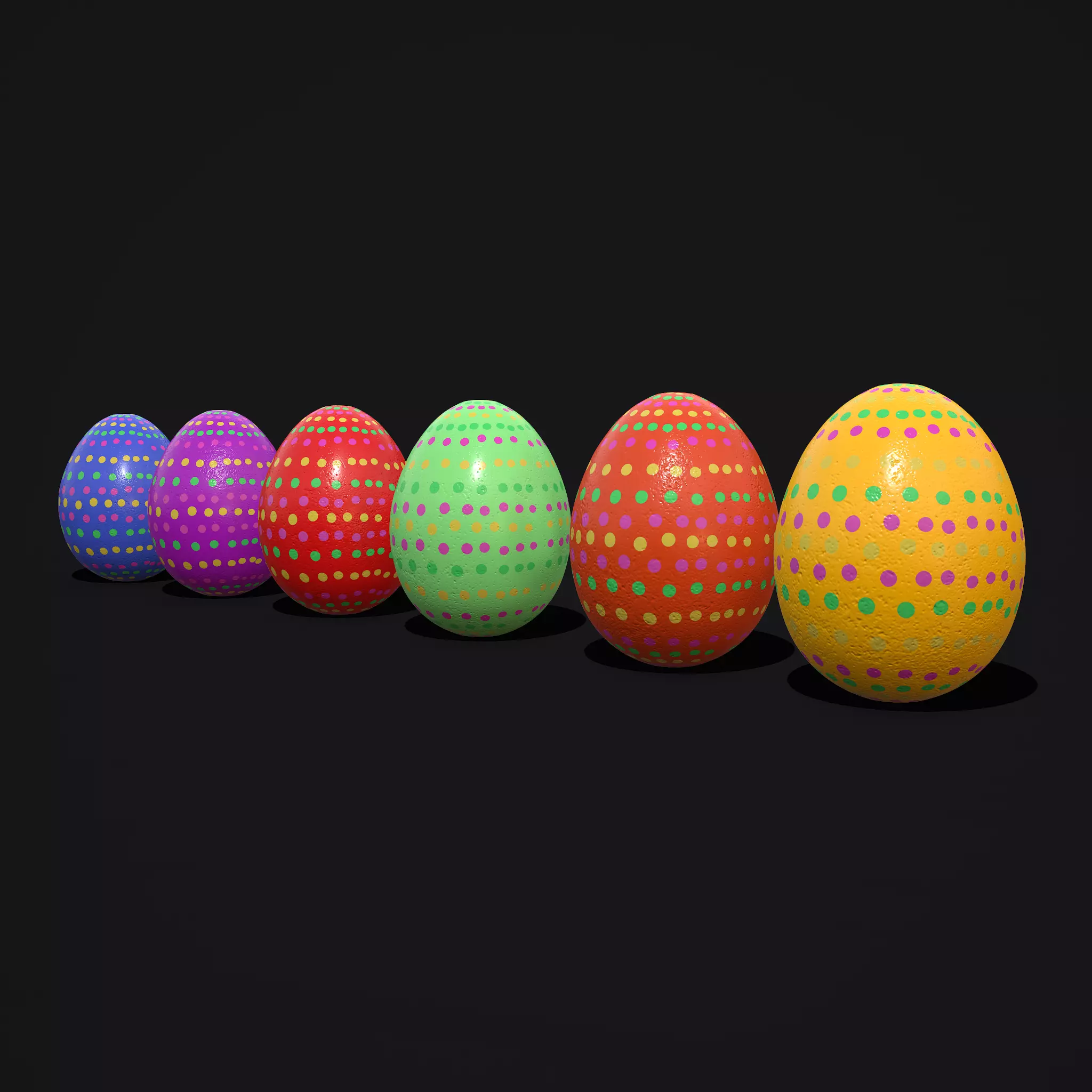 Easter Eggs Spotted 3D Model PBR Texture available in 4096 x 4096. Each Egg is Poly: 576 Vert: 581. Eggs can be Subdivided. Detailed Eggshell Normals. All Eggs share one material. All Preview renders were done Marmoset Toolbag 4 Scaled to real world scale. Customer Service Guaranteed. From the Creators at Get Dead Entertainment. Please like and Rate! Follow us on FaceBook and Instagram to keep updated on all our newest models and coupon giveaways.