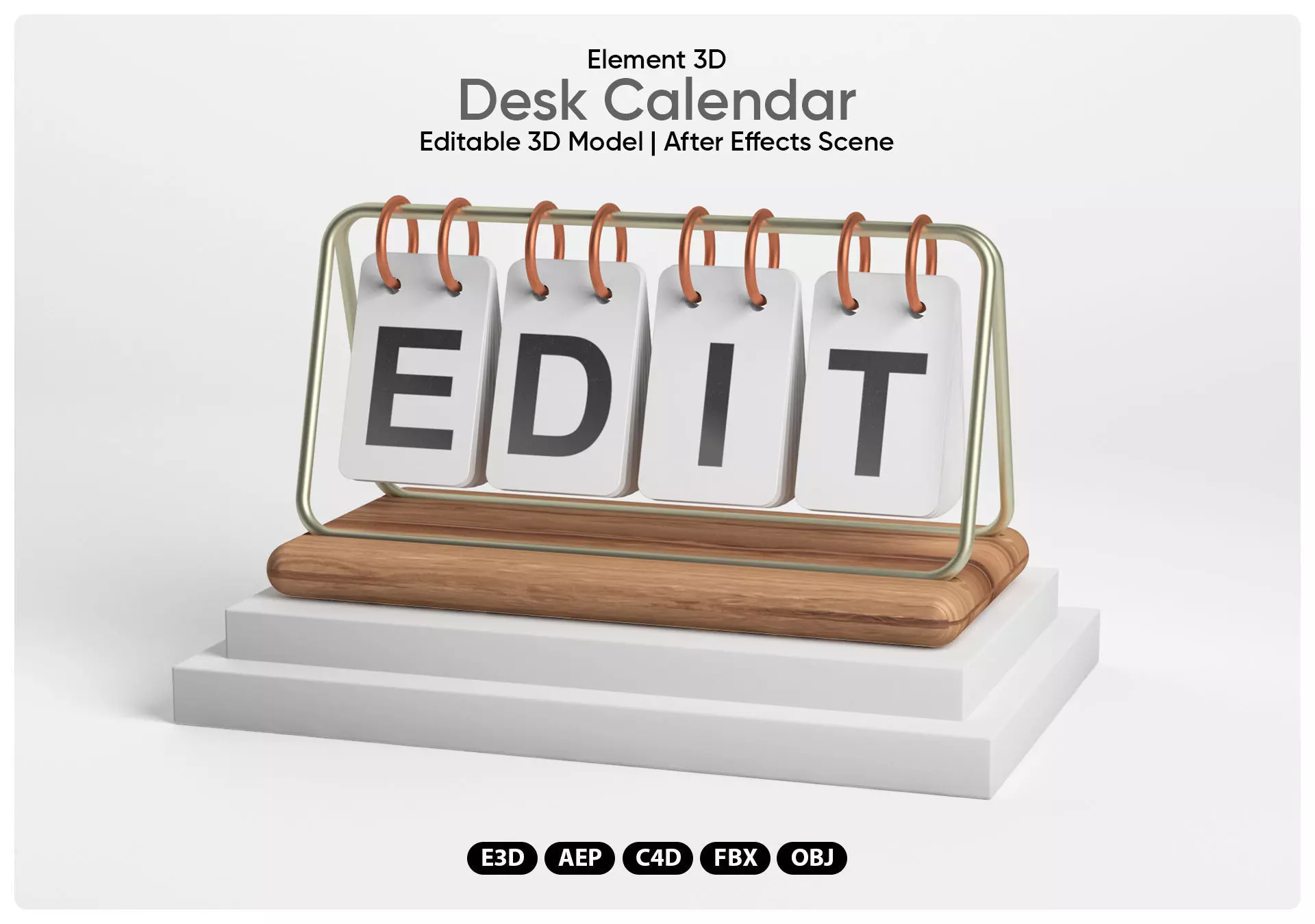 Desk calendar 3D model for Element 3D / After Effects / Cinema 4D. Allows real-time editing of the 4 date slots separately in After Effects using pre-comps. You can also apply edits to the Cinema 4D scene using the layered TIF texture files. Realistic PBR materials and lit scene included.