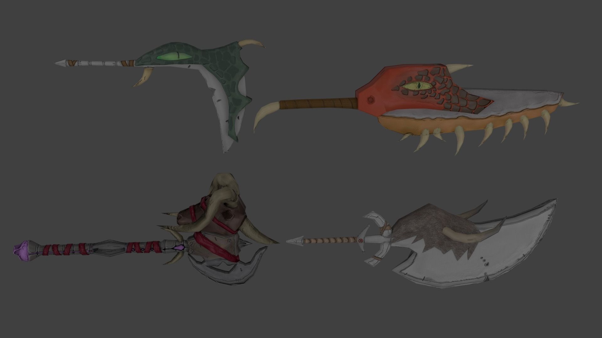 4 Low poly fantasy weapons for your projects. Sword: 974 faces, 1.2k. Axe: 932 faces, 1.1k Sickle: 1.1k faces, 1.2k. Mallet: 2.0k faces, 2.2k. Formats: .fbx, .dae, .obj, .mtl