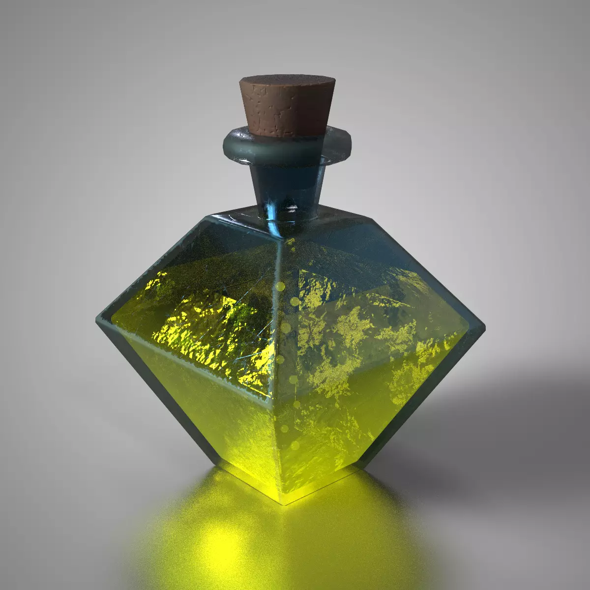 Sharp-cut fantasy glass bottle with bright yellow contents