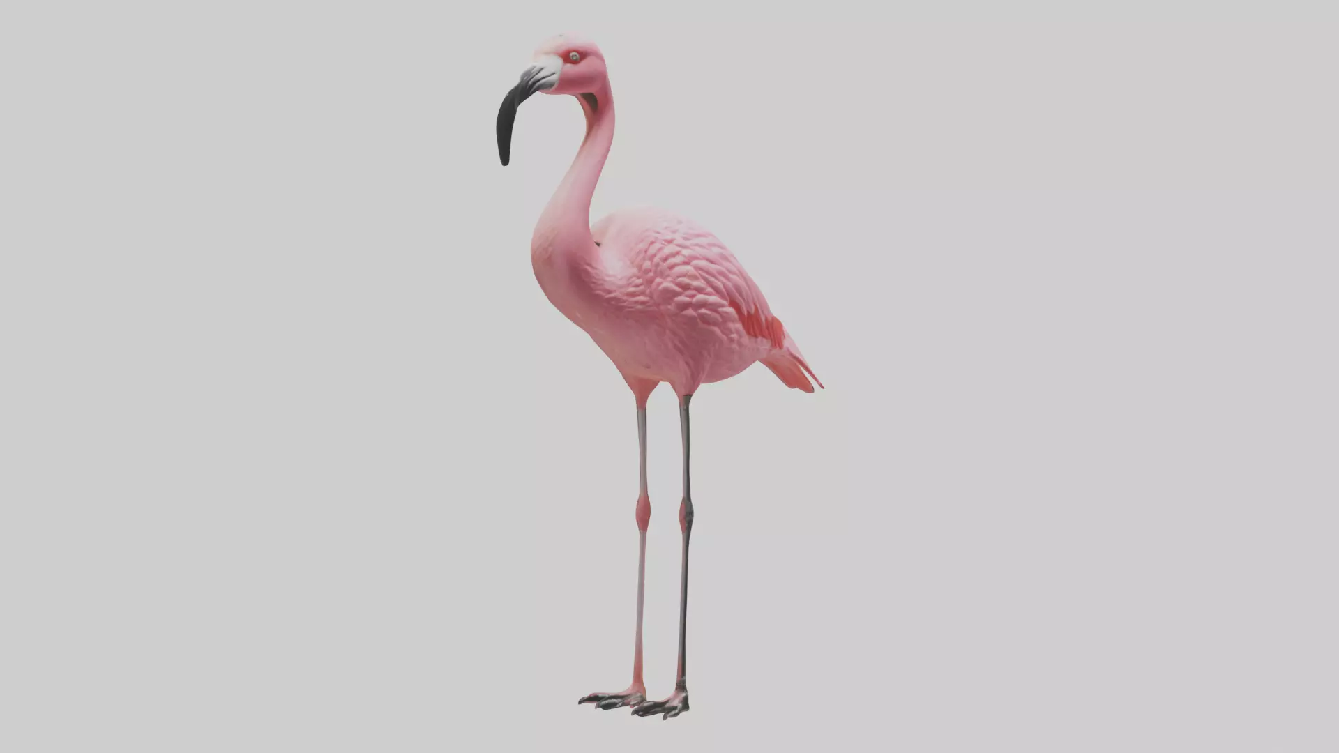 Detailed 3D model of a Flamingo in a Perched Pose. This model accurately depicts a flamingo (Phoenicopterus roseus or a similar species) resting in a perched position. The flamingo is likely standing on one or both of its long, slender pink legs, with its characteristic pink or reddish plumage clearly visible. The model showcases its long, curved neck and distinctive downward-bent beak. The wings are typically folded against its body. The pose can vary from relaxed and observant to actively preening its feathers. This 3D model is ideal for wildlife simulations, zoo environments, educational materials about birds, animation projects, or as a decorative element in natural scenes. The model is provided in multiple formats: FBX, OBJ, STL, GLB, USDZ, and BLEND, ensuring compatibility with a wide range of 3D software and platforms.