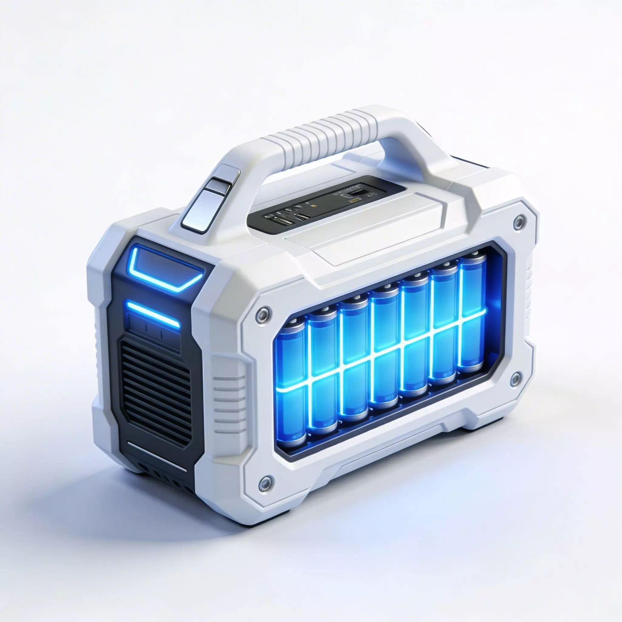 This portable energy generator features a ruggedized, high-tech industrial design with a clean, matte white composite exterior. The unit is characterized by reinforced corners, a heavy-duty integrated carrying handle with a textured black grip, and metallic recessed bolts for a durable, field-ready appearance. A prominent feature is the forward-facing battery bay housing eight glowing blue energy cells, each emitting a vibrant cyan light. The casing includes subtle surface weathering and ventilation slats, suggesting realistic use in demanding environments. Rendered with advanced PBR materials, the model emphasizes the contrast between the non-reflective white surfaces and the intense emissive glow of the power cells. This asset is an ideal interactive prop for sci-fi survival games, futuristic base environments, or high-tech laboratory scenes.