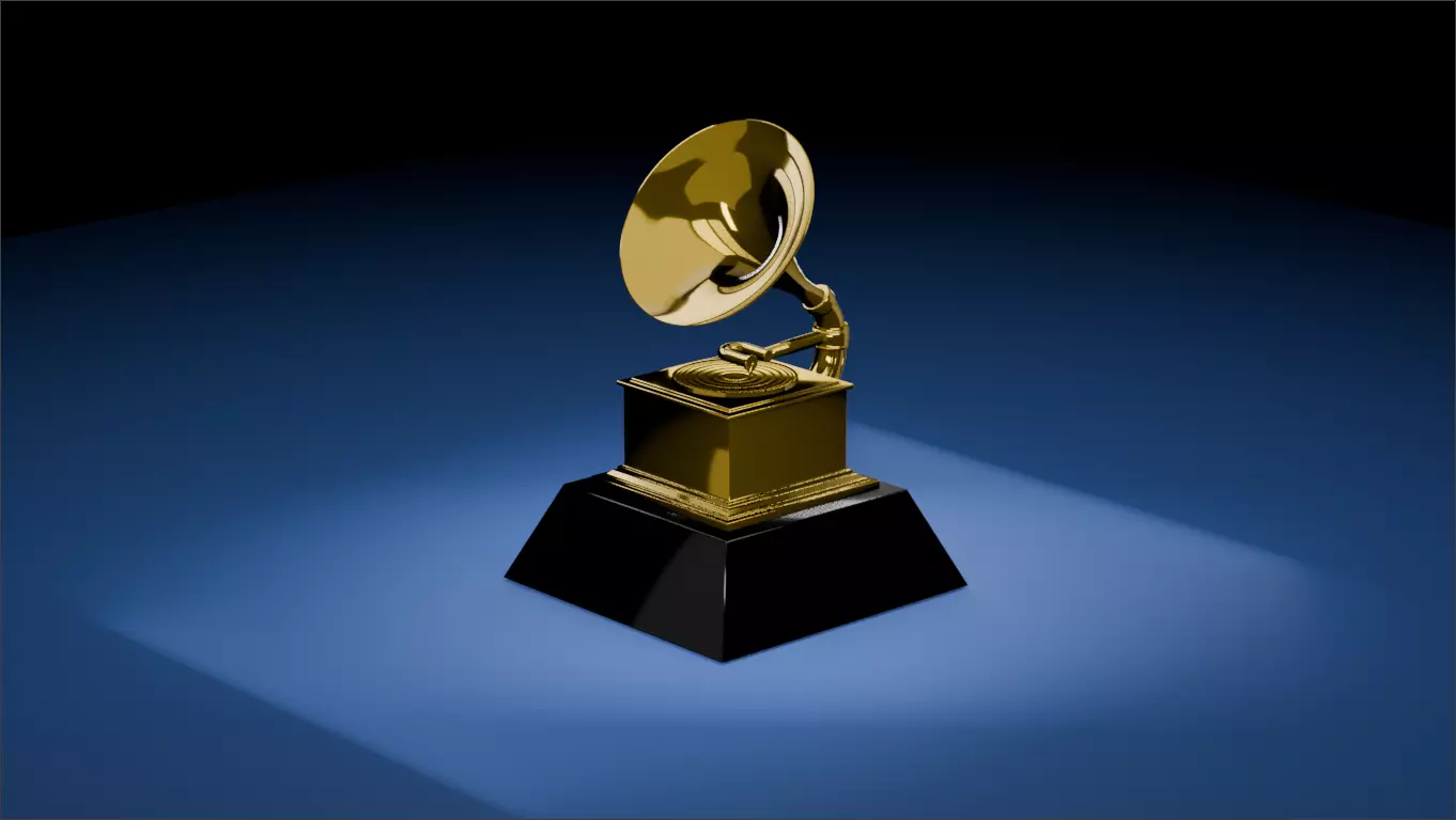 The model captures the classic design of the gilded gramophone, from the smooth curves of the horn to the intricate details of the turntable and tonearm. The entire trophy is finished with a lustrous, reflective gold material, set upon a sleek, black tiered base, conveying the prestige and honor the award represents.