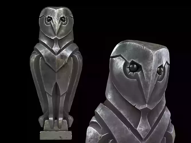A stylized metal owl statue 3D model featuring sharp geometric forms, weathered metallic PBR materials, and refined sculptural detailing. Built with clean topology and balanced textures, making it suitable for garden décor, architectural visualization, fantasy scenes, games, and real-time environmental storytelling.