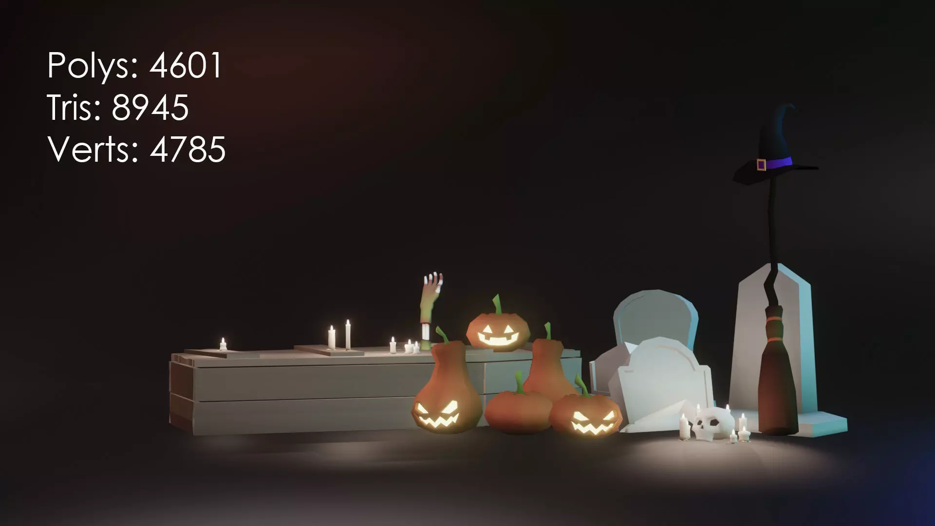 Halloween decoration setIncludes low poly models of:PumpkinsGravestonesCandlesSkullCoffinsWitch hat and broom