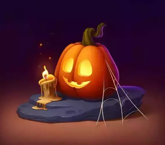 Download the enchanting 3D model of a Halloween pumpkin with candle, a digital recreation of a whimsical, cartoon-style spooky scene perfect for festive content and creative projects. This pumpkin 3D model features a bright orange jack-o'-lantern with a cheerful, glowing face — carved with round eyes and a wide smile — casting a warm, inviting light from within. The pumpkin sits on a dark stone slab, surrounded by a delicate spiderweb that adds a touch of mystery and charm. Beside it, a melting yellow candle flickers gently, its wax dripping down the side and creating soft sparks in the air, enhancing the magical atmosphere.