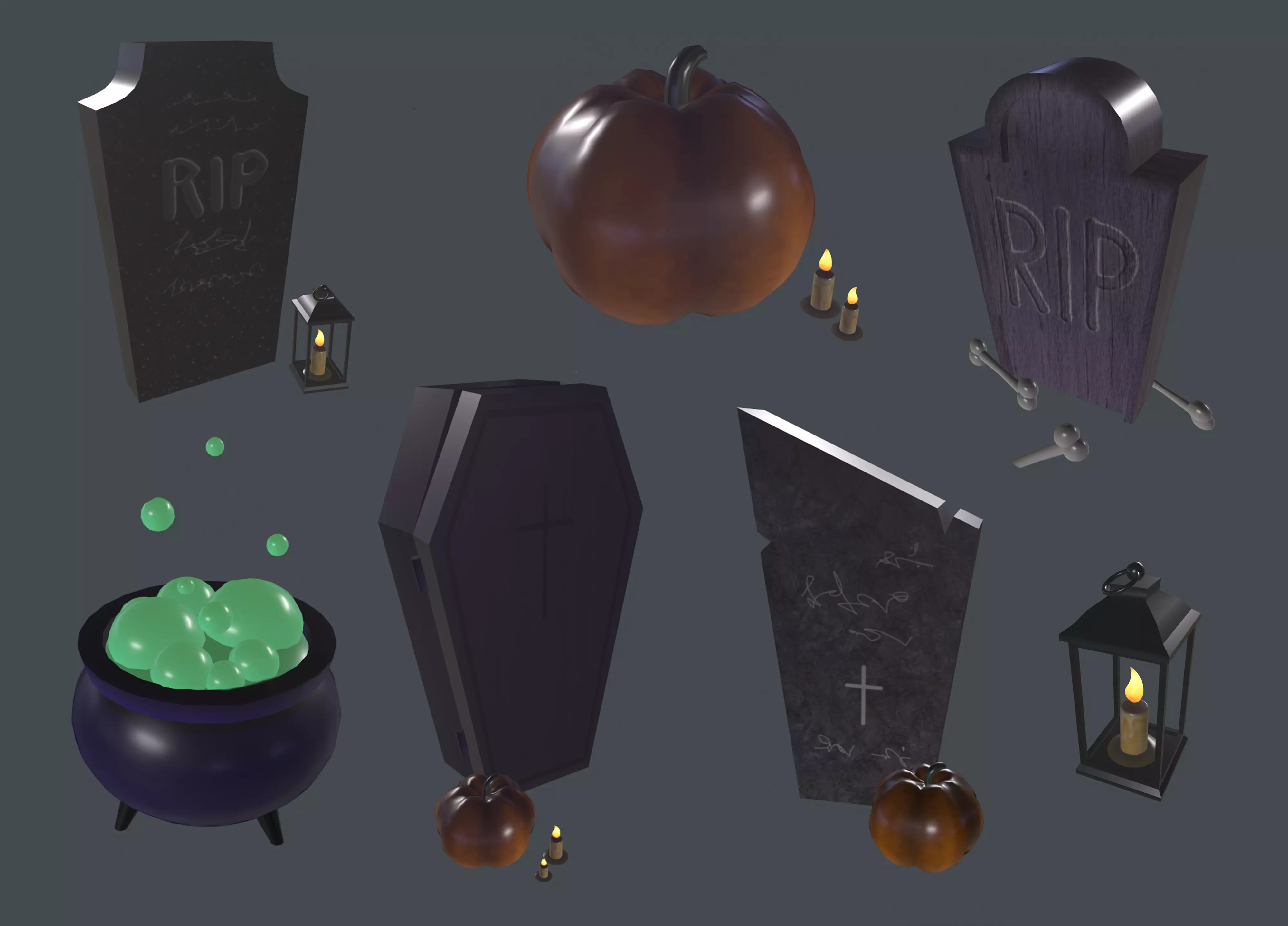Set includes lamp, pumpkin, potion cauldron, coffin and 3 tombstones. created in Maya, baked in Marmoset, textures made in Photoshop. Only low poly. The lamp has 1714 tris, 897 verts; it includes the main Maya file, .obj, albedo, ao and emission in .psd. The pumpkin has 2927 tris, 1526 verts; it includes the main Maya file, .obj, albedo, ao and emission in .psd. The tombstone2 has 2214 tris, 1201 verts; it includes the main Maya file, .obj, albedo and ao in .psd. The tombstone3 has 1219 tris, 622 verts; it includes the main Maya file, .obj, albedo and ao in .psd. The tombstone4 has 1778 tris, 931 verts; it includes the main Maya file, .obj, albedo, ao and emission in .psd. The coffin has 3291 tris, 1716 verts; it includes the main Maya file, .obj, albedo, ao and emission in .psd. The potion cauldron has 3402 tris, 1838 verts; it includes the main Maya file, .obj, albedo, ao and emission in .psd.