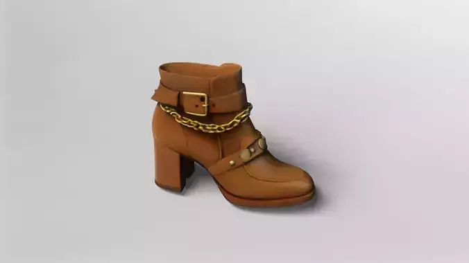 This 3D model features a stylish high heel leather ankle boot, designed with meticulous attention to detail. The boot is rendered in a rich tan leather texture, giving it a luxurious and authentic appearance. The design includes a prominent gold buckle at the ankle, a decorative gold chain, and embossed gold buttons, all of which add a sophisticated and fashionable touch to the overall look.The boot is constructed with a block heel, providing both elegance and stability. The stitching and paneling on the leather surface are accurately modeled, enhancing the realism of the asset. The gold hardware elements are carefully textured to reflect light naturally, making the model suitable for high-end fashion visualization and virtual try-ons.This asset is ideal for use in fashion design presentations, character modeling, or virtual showrooms. The model is available for download in gmb format, with all textures included to ensure seamless integration into your projects. Additionally, an fbx format is provided for compatibility with a wide range of 3D software applications.Whether for animation, rendering, or interactive applications, this high heel leather ankle boot model offers a premium, ready-to-use solution for any fashion-focused 3D project. The included textures and detailed mesh guarantee a professional finish and realistic appearance in any digital environment.