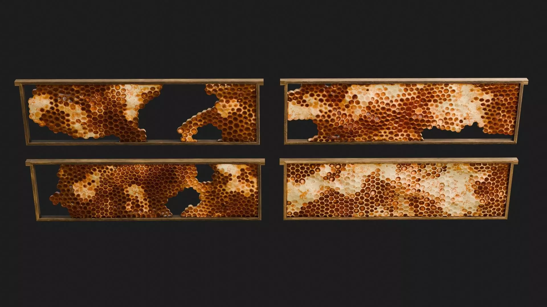 This is a set of 4 Honeycomb Frames, great for any beehive scene, renser, anaimation, etc. The meshes are highly detailed, making them great for closeups. the mesh is viewable from all distances and anagles. The mesh is also UV unwrapped for easy retexturing.
