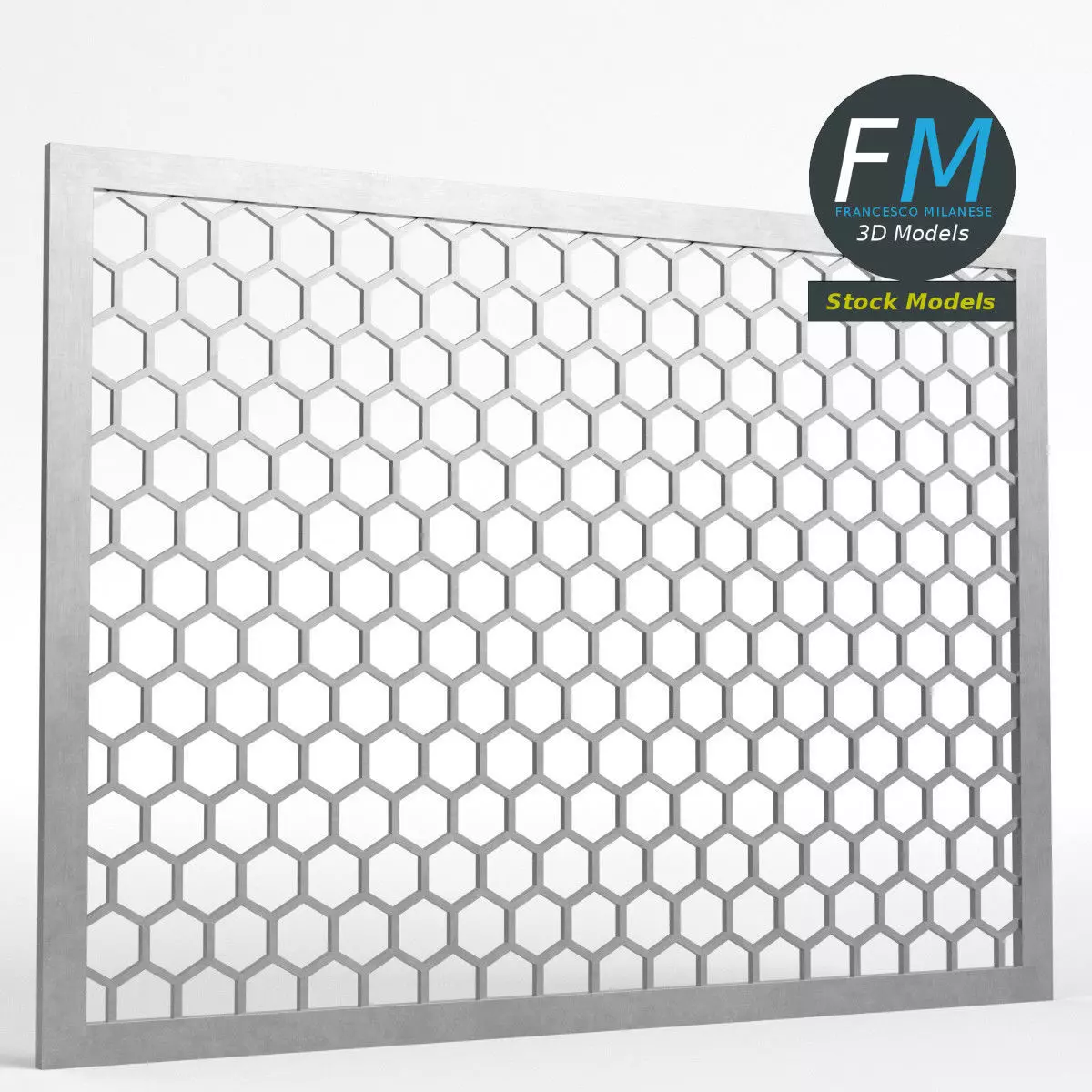 Modular honeycomb grid panel 3D Model. 2 individual objects (frame, grid), sharing the same non overlapping UV Layout map, Material and PBR Textures set. Production-ready 3D Model, with PBR materials, textures, non overlapping UV Layout map provided in the package.Quads only geometries (no tris/ngons).Easily customizable: UV unwrapped geometries; UV Layout maps provided in the package as png with alpha images.Each Object, Material or Texture provided in the package has a unique, meaningful name.Made in Blender 4.1 with Cycles Principled BSDF PBR shader with textures included (Eevee compatible), then exported to OBJ and FBX; materials and textures made in Substance Painter (Adobe 3D Painter), exported for PBR, Cycles, V-Ray, Unity, Unreal.PROMO IMAGES: the first image has been rendered in Cycles for Blender; in particular, you can find 11+ promo images in this description: