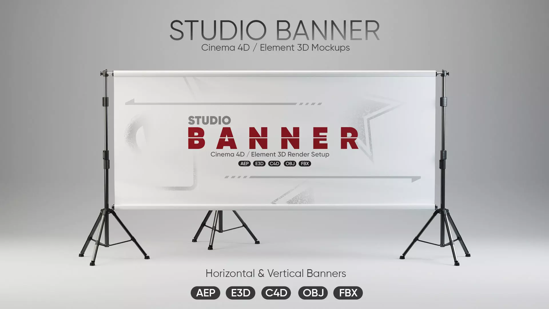 Realistic and versatile banner mockups, featuring wavy horizontal / vertical canvases held by studio stands (tripods) with realistic lighting. Edit each banner content in Cinema 4D / Photoshop, or use the included After Effects template (Element 3D). Render beautiful mockups in seconds. Arnold & Physical lighting and materials included.