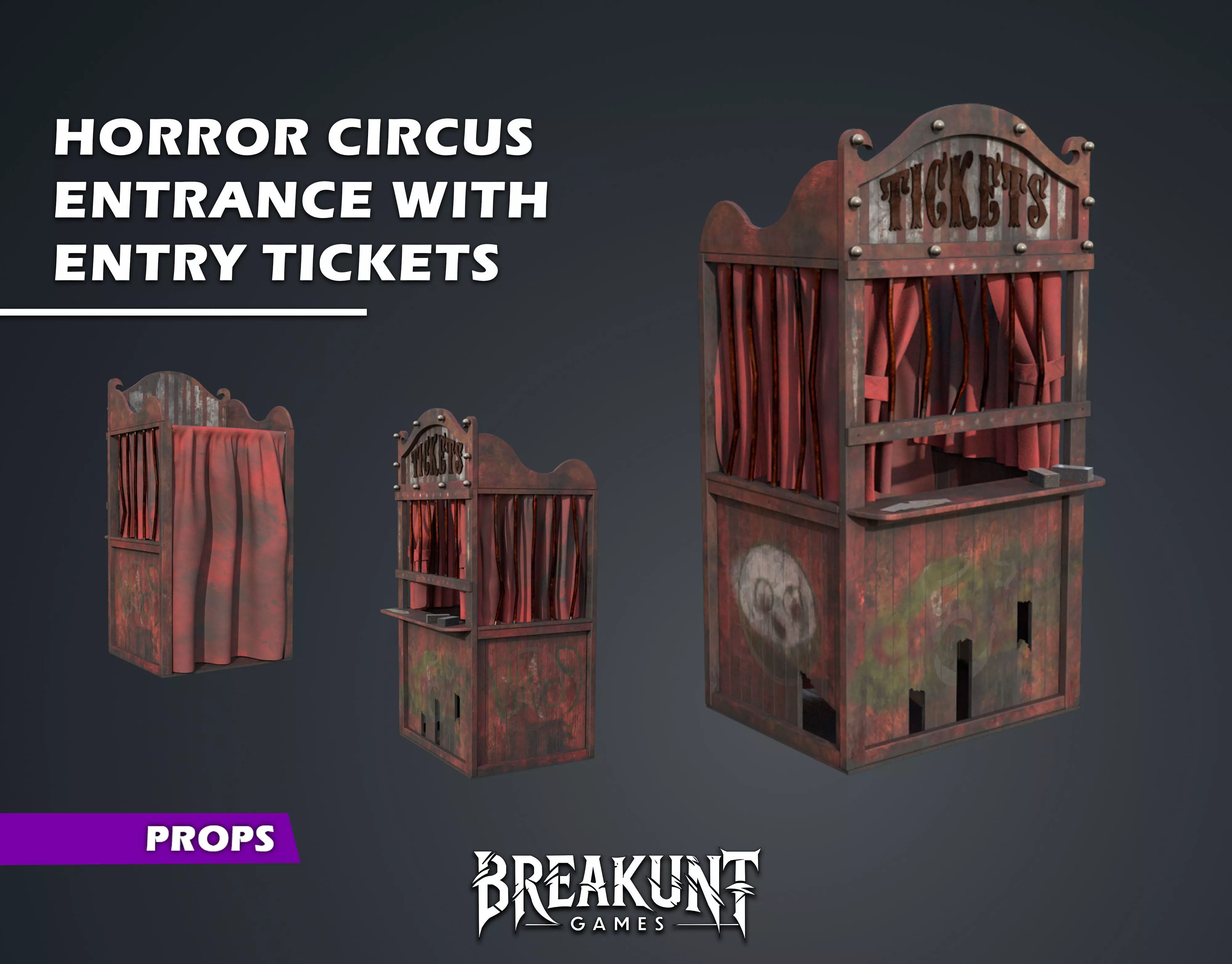 Tags :circus, horror, ticket booth, haunted, creepy, vintage, old, dark carnival, PBR, game ready, booth, admission, spooky, fair, kiosk, horror circus, abandoned, modular, halloween, low poly, optimized, UV unwrapped, texture set, baked textures, realistic, detailed, 4k textures, ambient occlusion, metallic roughness, realistic PBR, game asset, horror game, level design, environment prop, 3D environment, interactive asset, Unreal Engine, Unity, stylized game, visual storytelling