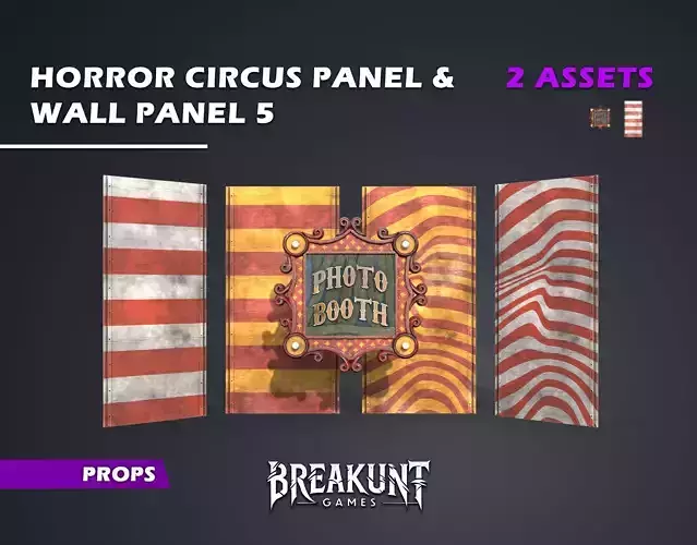 Tags :horror, horror circus, circus, carnival, haunted carnival, haunted circus, funfair, fairground, carnival booth, photobooth, photobooth, photo booth sign, sign, signboard, signage, marquee, marquee sign, marquee lights, bulblights, light bulbs, vintage sign, retro sign, ornate frame, victorian frame, circus wall, wall panel, wood panel,wooden panel, plank wall, wood planks, distressed wood, weathered wood, aged wood, painted wood, stripedwall, red white stripes, red yellow stripes, wavy stripes, carnival stripes, circus pattern, prop, environment,environment prop, set dressing, level design, modular, modular wall, modular prop, game ready, game asset,realtime, real-time, PBR, textures, materials, albedo, normal map, roughness, metallic, AO, 4k, 2k, unreal,unreal engine, unity, blender, maya, 3ds max, substance, substance painter, substance designer, escape room,haunted house, spooky, creepy, eerie, dark carnival, clown theme, halloween, halloween decor, event decor,theme park, circus tent, sideshow, freakshow, vintage carnival, carnival decor, carnival backdrop, photoboothbackdrop, booth facade, stage prop, stylized, stylized realism, handcrafted, ornamental, curled frame,scrollwork, wood texture, paint texture, grunge, scratches, wear, tear, interior, exterior, architectural prop, streetprop, sign post, wall decoration, wall decor, paneling, board, boards, stripe texture, red, yellow, white, blue,green, circus colors, old paint, cracked paint, low poly, lowpoly, high poly, highpoly, LOD, optimized, UVunwrapped, UVs, baked, game environment, horror environment, carnival environment, photography, photoarea, selfie spot, attraction sign, fair sign, amusement park, amusement, fair booth, carnival facade, park prop