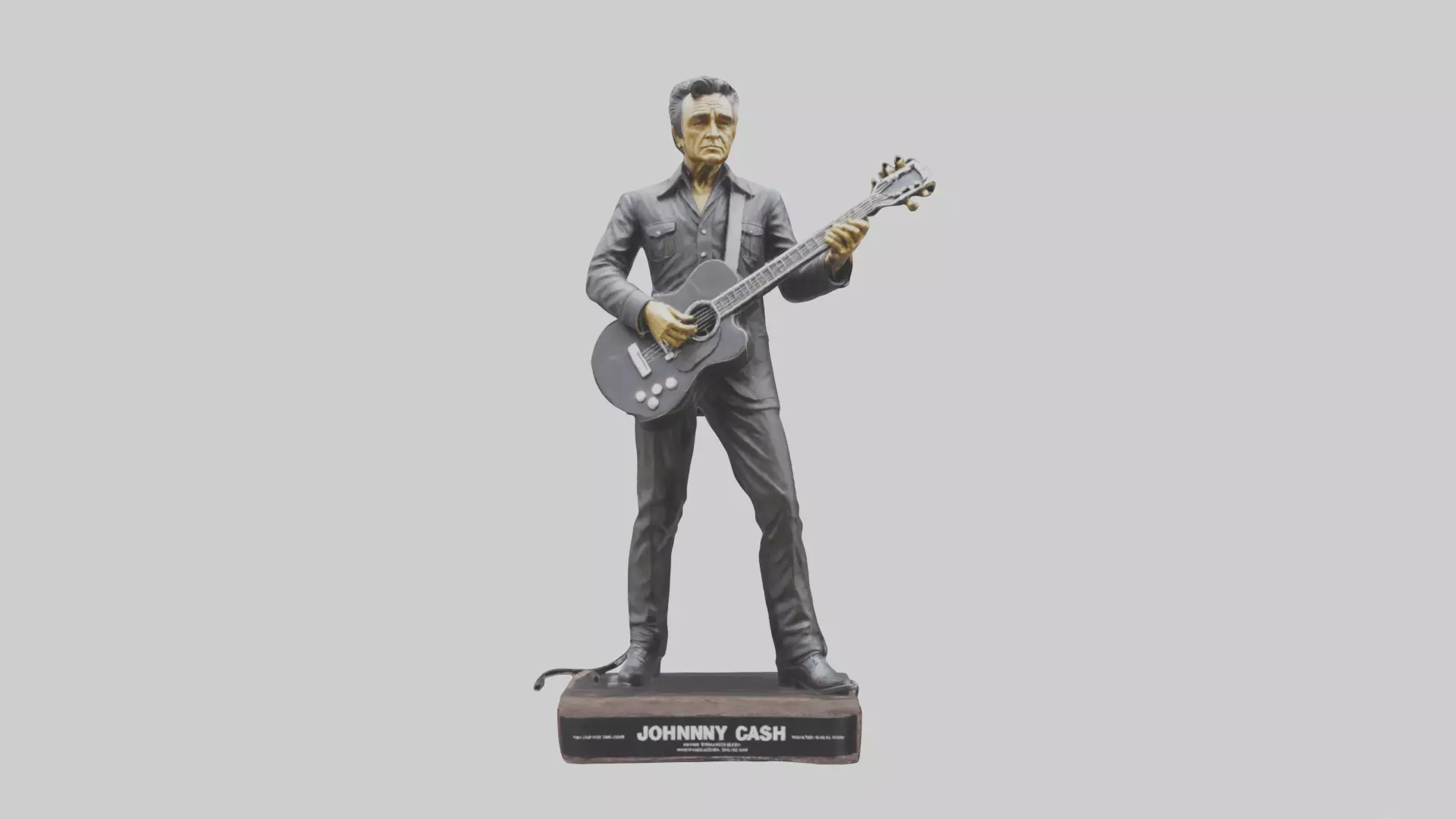 Concise 3D model of a Johnny Cash statue. Depicts a statue of Johnny Cash (J. R. Cash), the iconic American singer, songwriter, and musician known as The Man in Black, often shown in his signature dark clothing and possibly holding a guitar. Suitable for music history, country music, and commemorative visualizations. Available in FBX, OBJ, STL, GLB, USDZ, and BLEND formats.