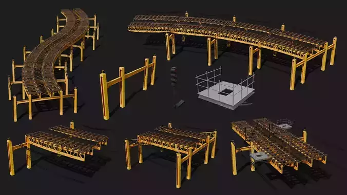 A switchback with railway curve doing a slight s-bend sectionAn eighth bend - 11.25 degree slight rail track bend sectionA quater bend - 22.5 degree slight rail track bend sectionA half bend - 45 degree slight rail track bend sectionA direction change or track swop sectiona bridge plain sectiona bridge beamed or braced section - alternate the different types for detailA cross beam - add where it makes senseLadder access platforms, add where you want detailtrack stop go lights