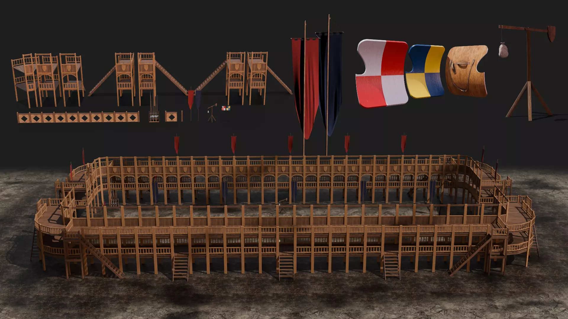 This 3d asset pack contains a medieval jousting arena and pitch, lance and lance racks, ecranche or tilt sheild and training quintain used by knights in the middle ages. The kit is modular and offers many arean options. The 3d Kit can be used to create relistic 3d renders for film, freelance, animation look dev, and environment building.