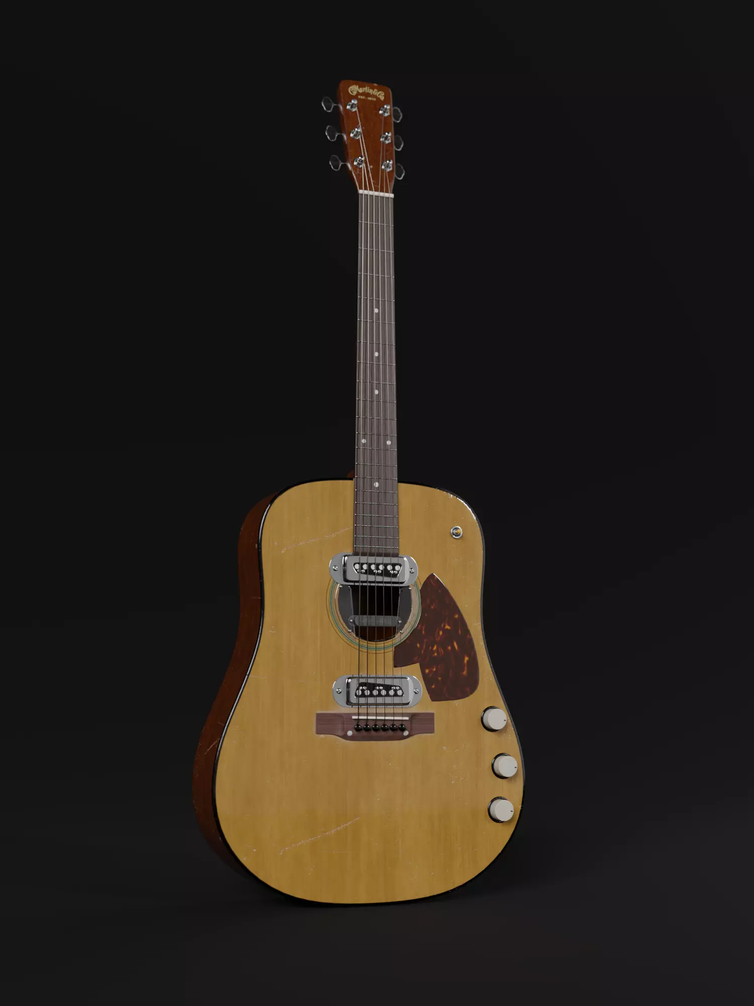 This is a 3D model based on Kurt Cobain's Martin D18E, used on Nirvana's MTV Unplugged performance.The model was created aiming to be a 1:1 representation of the original guitarFully texturized inside Substance Painter in 4K with 3 Udims and Shaded in Blender.