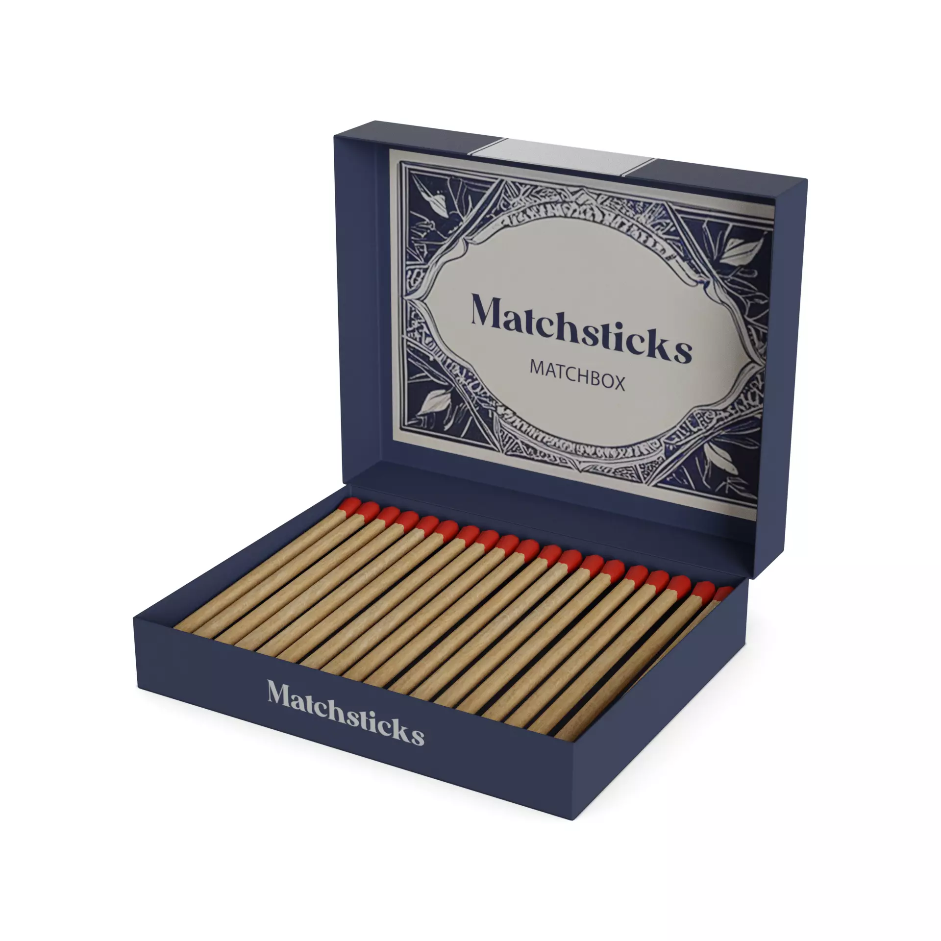 Matchsticks: A box of wooden matchsticks, perfect for lighting candles, fireplaces, and stoves. The matchsticks are housed in a compact cardboard box, adorned with a vintage-inspired design featuring a striking matchstick motif. The packaging includes a label with the text Matchsticks in decorative font, along with a graphic of a lit match. Each box contains approximately 100 matchsticks, ensuring you always have a reliable source of ignition.