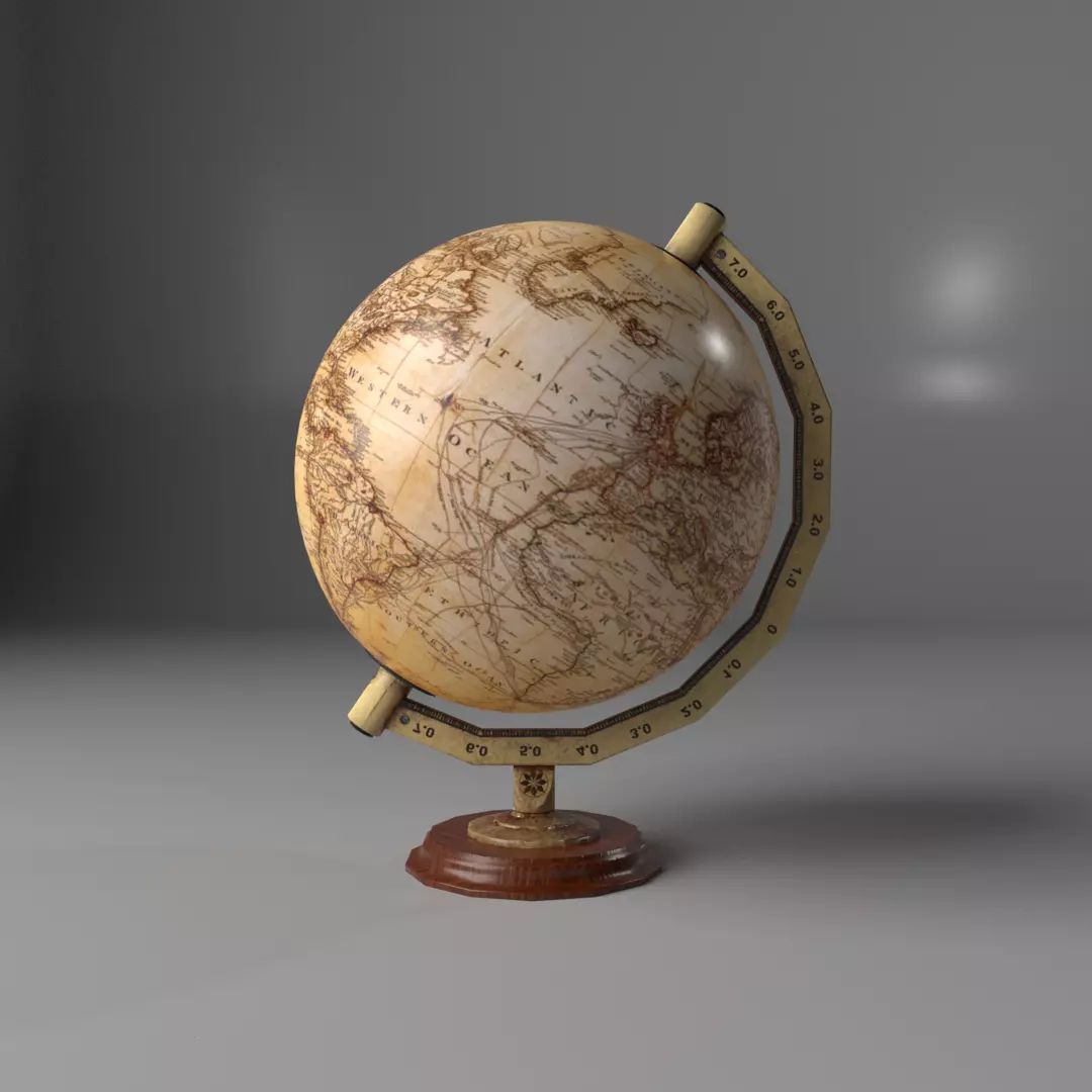 This is a low-poly antique globe model with PBR textures and materials.