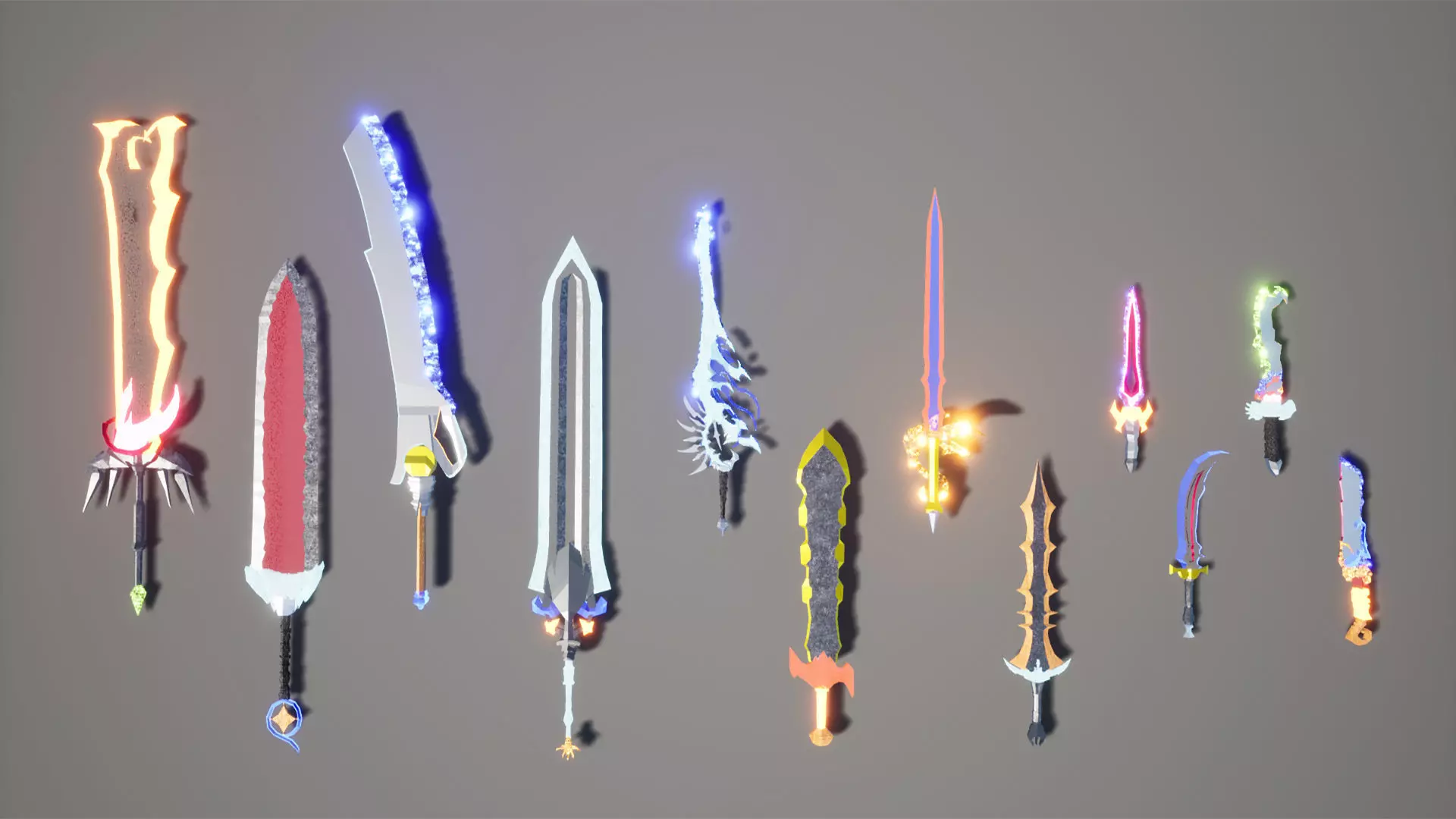 The package contains 50 weapons, 21 swords, 19 heavy swords and 10 daggers, they can be used in RPG, ARPG, medieval fantasy, combat, low poly or any game that you can think of including them.