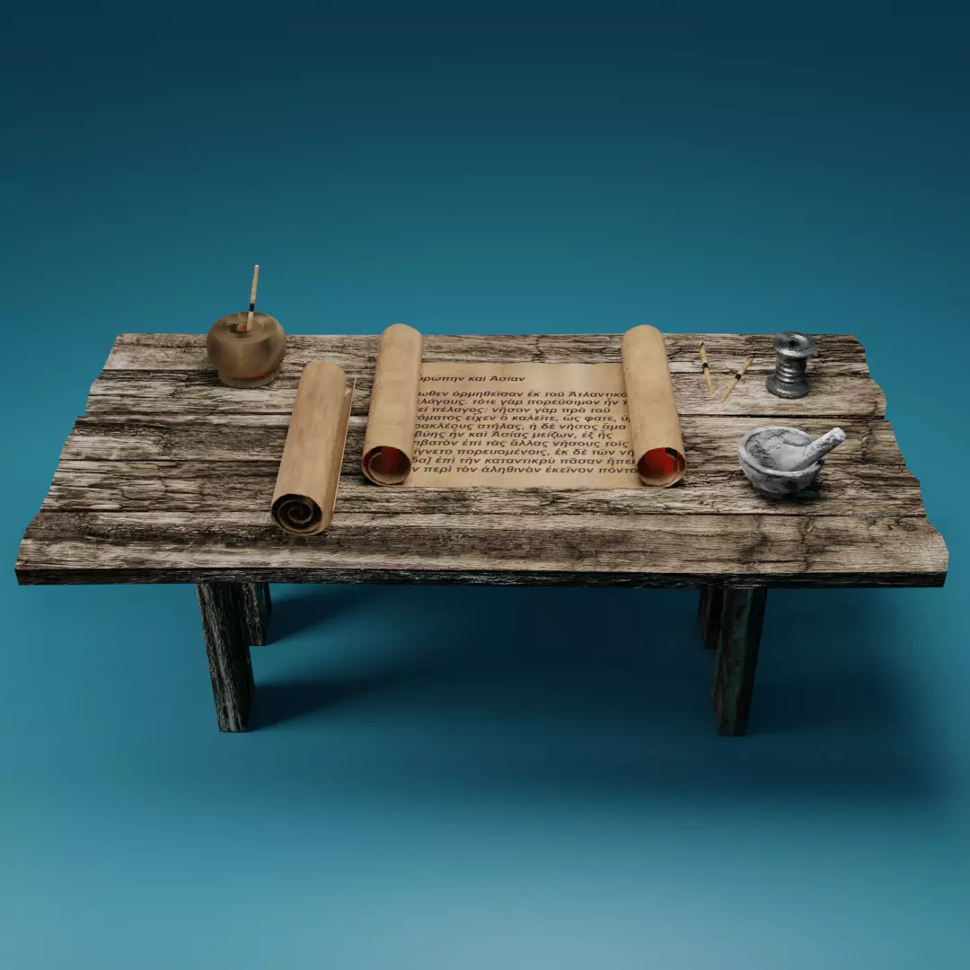En este paquete encontraras una mesa de madera, tinteros de madera y metal, 3 cálamos de escritura, un mortero, un pergamino cerrado y uno abierto con texto en griego. Un conjunto perfecto para cualquier escena antigua. Todos los objetos son low poly, texturizados, y con UV’S listas y no solapadas, todo listo para utilizar. Valores totales del paquete:Objectos: 9vértices: 6.505Bordes: 12.640Caras: 6.178Tris: 12.928