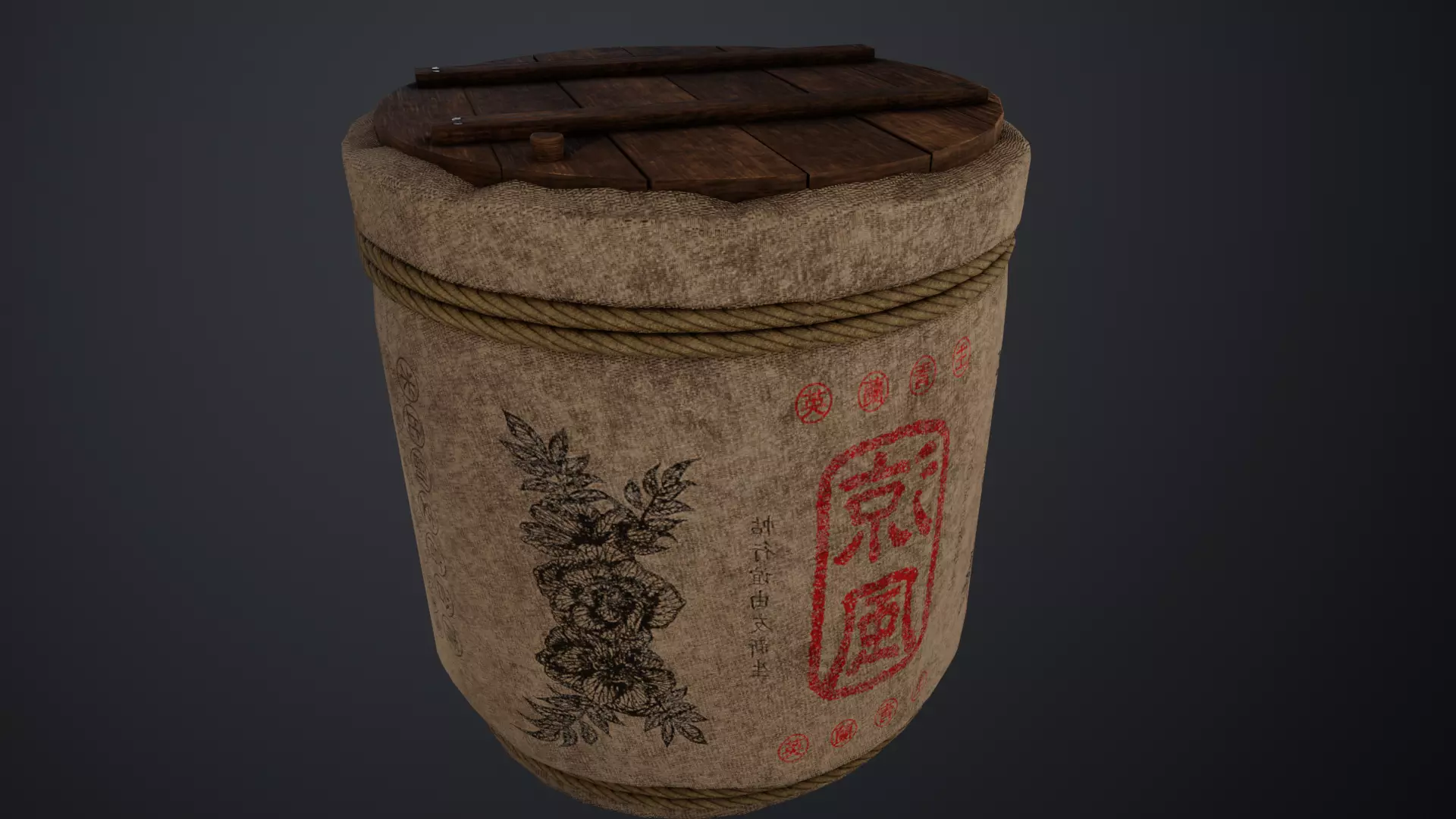This is a lowpoly 3D model of a traditional Japanese sake barrel, commonly used for decorative and ceremonial purposes. The model is designed with an optimized polycount, featuring detailed textures that replicate the authentic look of wood, fabric, and rope.