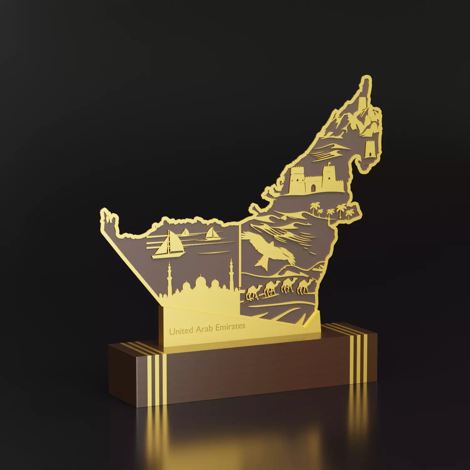 A premium UAE Map Trophy designed for high-end interior renders, national celebrations, and corporate awards. This asset features a detailed golden map silhouette of the United Arab Emirates