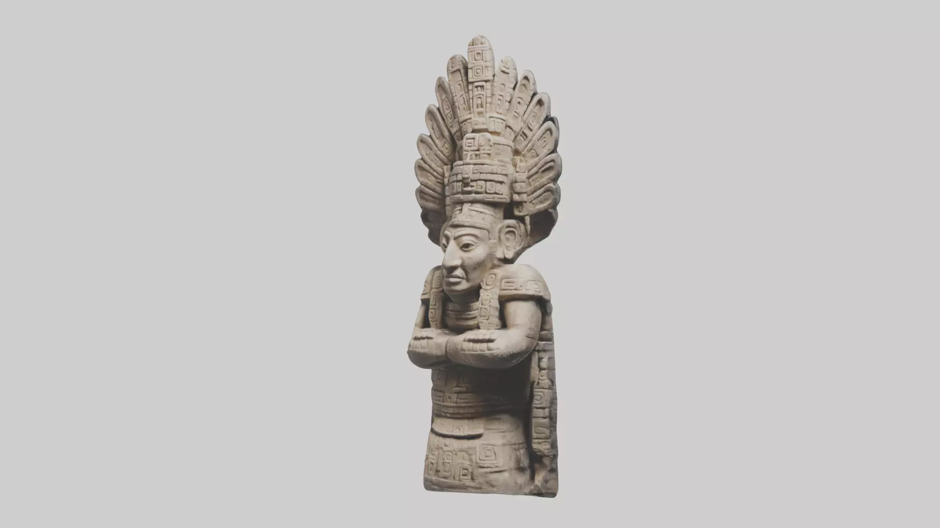 Concise 3D model of a Mayan Priest statue. Depicts a 3D representation of a statue of a religious figure from the ancient Mayan civilization. The model should capture the characteristic attire and adornments of a Mayan priest, which might include elaborate headdresses made of feathers and other materials, ornate robes or loincloths, and various symbolic objects or jewelry. The priest's posture could be formal and ceremonial, perhaps holding a ritualistic item like a staff, a censer, or a sacrificial knife. Facial features might reflect the typical Mayan appearance, and the expression could convey solemnity, wisdom, or spiritual power. The style can range from realistic representations based on archaeological findings of Mayan art and architecture to more stylized or artistic interpretations. The material of the statue could be imagined as carved stone (like limestone or jade), stucco, or possibly even wood. Suitable for historical visualizations, archaeological studies, museum exhibits (virtual), educational resources about the Mayan civilization, and projects related to ancient Mesoamerican cultures or religious practices. Available in FBX, OBJ, STL, GLB, USDZ, and BLEND formats.