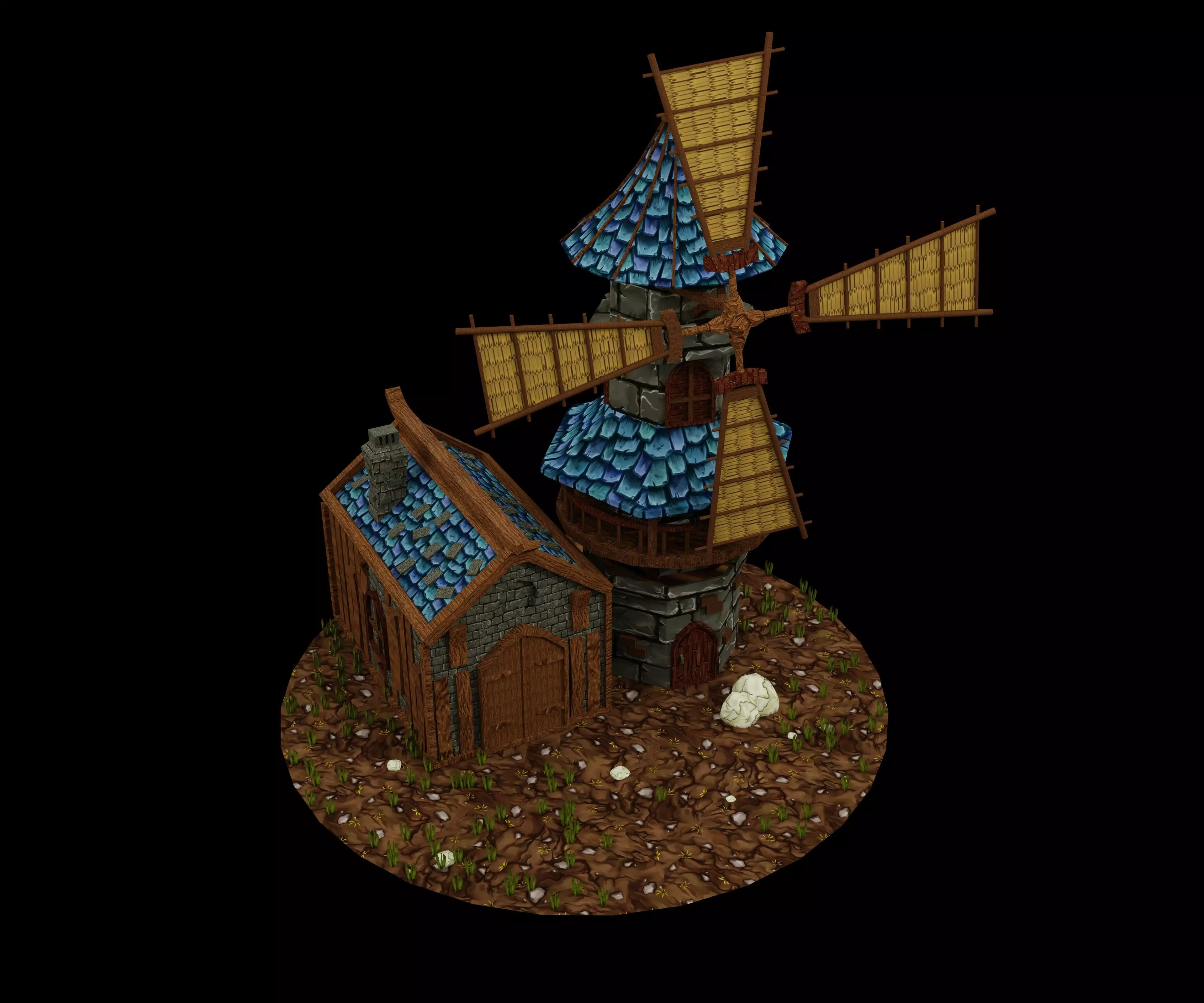 Medieval mill and barn with stylized visuals. The textures were cooked on the Blender. Compatible with game engines.