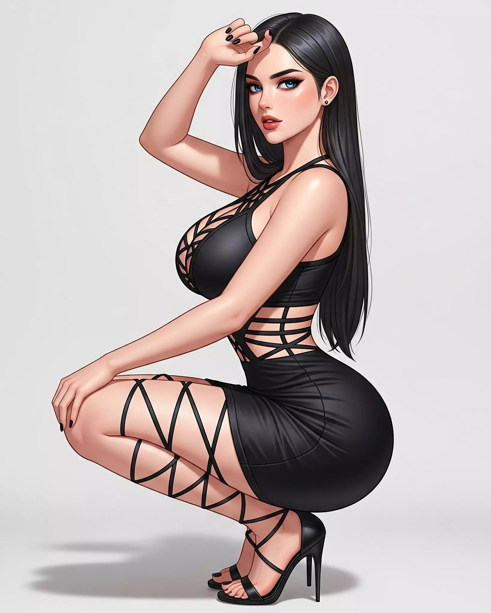 A digital illustration of a sultry woman with long, straight black hair and striking blue eyes, rendered in a pin-up aesthetic. She is depicted in a provocative, squatting pose, wearing a form-fitting black mini-dress that features intricate strappy details across the torso and legs, resembling a stylized corset and thigh-high wraps. The outfit is completed with matching black high-heeled sandals. This piece is designed for a 3D print model, emphasizing the voluptuous figure and sharp lines, appealing to collectors of dark fashion and glamour art styles.