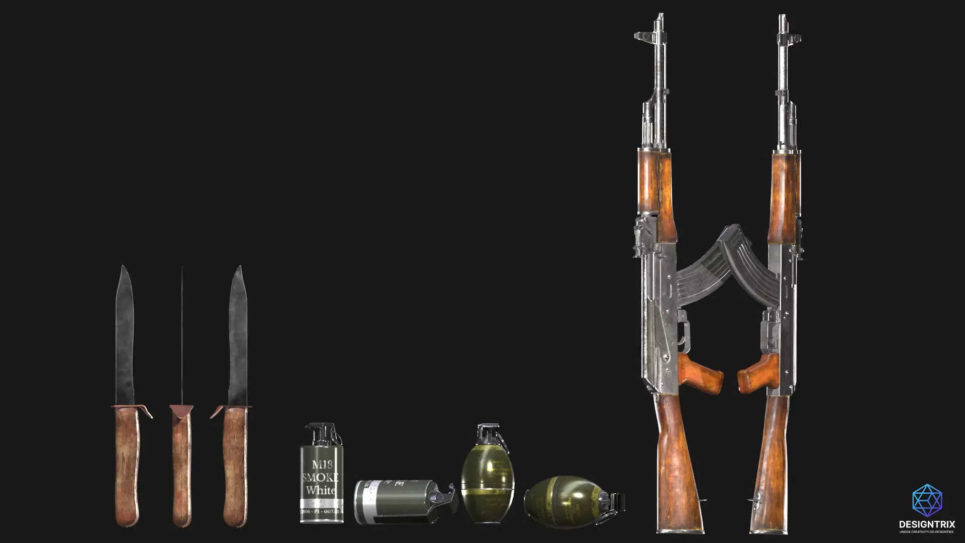 This 3D asset set presents a highly detailed and realistic collection of military weapons and tactical gear, ideal for use in video games, simulations, or cinematic scenes. The pack includes knive featuring rugged wooden handles and worn steel blades, reflecting realistic wear from battlefield use. A variety of grenades are also included, such as an smoke grenade and classic fragmentation grenades and AK-4 rifle.showcased in a dramatic crossed configuration, with authentic wooden grips and metallic finishes that exhibit subtle scratches and signs of use. The models are crafted with precision and utilize high-resolution PBR textures to enhance realism, making them perfect for first-person shooters, military-themed environments, or visual storytelling in war-based scenarios.
