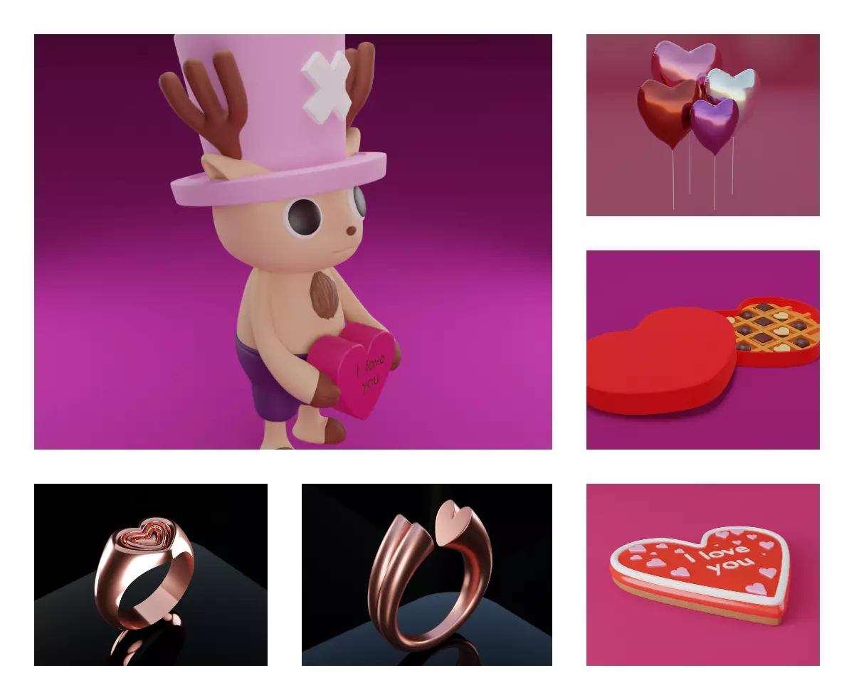 The content itself is a set of six high-poly 3D models designed for Valentine's Day and is intended for projects, animation, advertising, videos, themed design, holidays, etc.