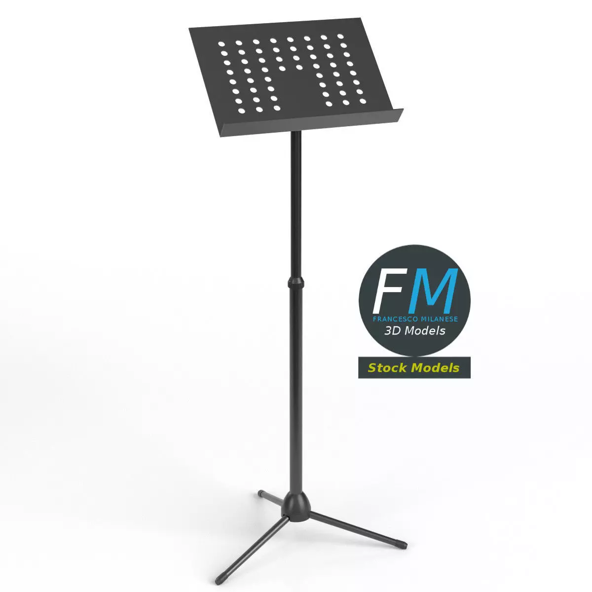 Music stand 3D Model, nr. 2 in my collection. 4 individual objects (tripod base, tripod extension, tripod rotating top, stand; so, you can easily edit or even animate it), sharing the same non overlapping UV Layout map, Material and PBR Textures set. Production-ready 3D Model, with PBR materials, textures, non overlapping UV Layout map provided in the package.Quads only geometries (no tris/ngons).Easily customizable: UV unwrapped geometries, so you can create new Textures (or modify the existing ones) using the UV Layout maps provided in the package (as png with alpha).Each Object, Material or Texture provided in the package has a unique, meaningful name.Made in Blender 3.1 with a Cycles PBR shader with textures included (principled and Eevee compatible), then exported to OBJ and FBX; materials and textures made in Substance Painter, exported for PBR, V-Ray, Unity, Unreal.PROMO IMAGES: the first image has been rendered in Cycles for Blender; in particular, you can find 11+ promo images in this description: