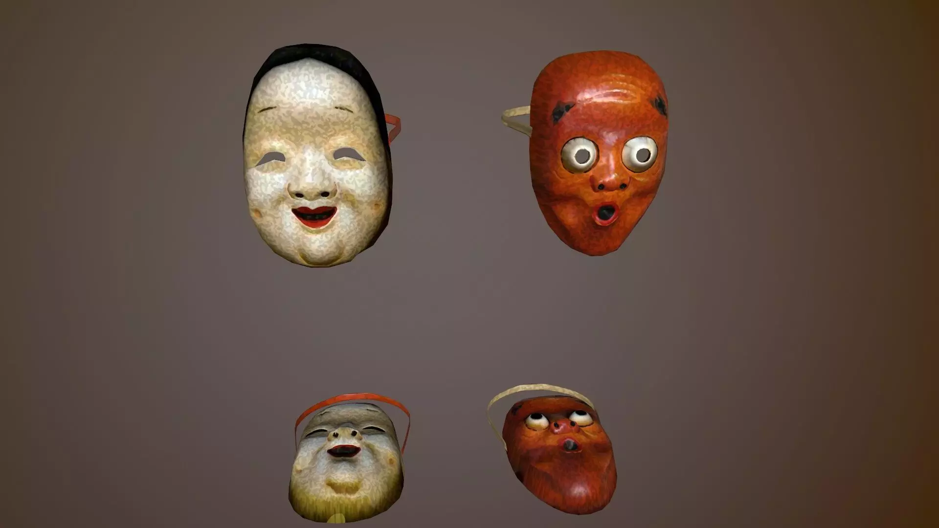 Okame is a smiling mask that symbolizes good luck and joy in japanese culture. The archive contains two versions, one to attach to a character (game or movie), and the other for decoration in a wall! Made with Blender.