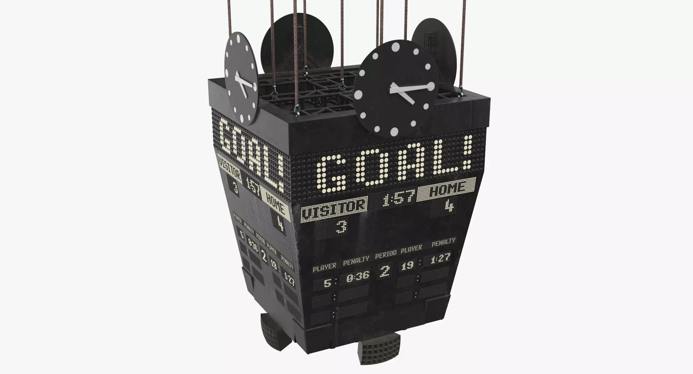 This Old Ice Hockey Scoreboard GOAL is a high end, photorealistic 3D model, that will help you to add realism to your project. The model is suitable for any visual production - broadcast, high-res film close-ups, advertising, games, design visualisation, forensic presentation, etc. <br/><br/>The model was initially created in 3Ds Max 2012, then fully textured and rendered using V-Ray. <br/><br/>All geometry and visual aspects of the model are optimised to give you the highest possible quality for up to 2k renders. There is no post-production used on any of the renders you see. <br/><br/>Features: <br/><br/> -This model is accurately sized to match the real object. <br/> -Objects are grouped and named according to their real purpose, allowing the model to be rigged and animated smoothly. <br/> -Clean and optimised topology is used for maximum polygon efficiency. <br/> -Model is fully sub-dividable to allow Turbosmooth Iterations to increase mesh smoothness if needed. <br/> -All textures and materials are tailored and applied for high-quality render results. <br/> -All objects have fully unwrapped UVs. <br/> -No extra plugins are required for this model. <br/> -Lights and cameras are not included in the scenes. <br/><br/>Technical Specifications: <br/><br/> -Model is included in 4 file formats. <br/> -3ds Max V-Ray <br/> -3ds Max Mental ray <br/> -Cinema 4D R17 V-Ray <br/> -OBJ <br/> -Model consists of 735309 Faces and 938447 Vertices. <br/> -Model Dimensions: 951.7567cm x 952.6056cm x 2256.6382cm <br/> -Units in all formats: #centimeters <br/> -All Textures are PNG format with the following resolutions: <br/> - 4096 x 4096 px <br/><br/>Additional Notes: <br/><br/>This model was created for 29 hours form our Leading 3D artists to ensure you get the best quality model and save precious production time. <br/><br/>Are you looking to purchase more than one of our products? If so, we might be able to create a collection of products with a discount just for you! <br/>Please contact us through the support for any inquiries.