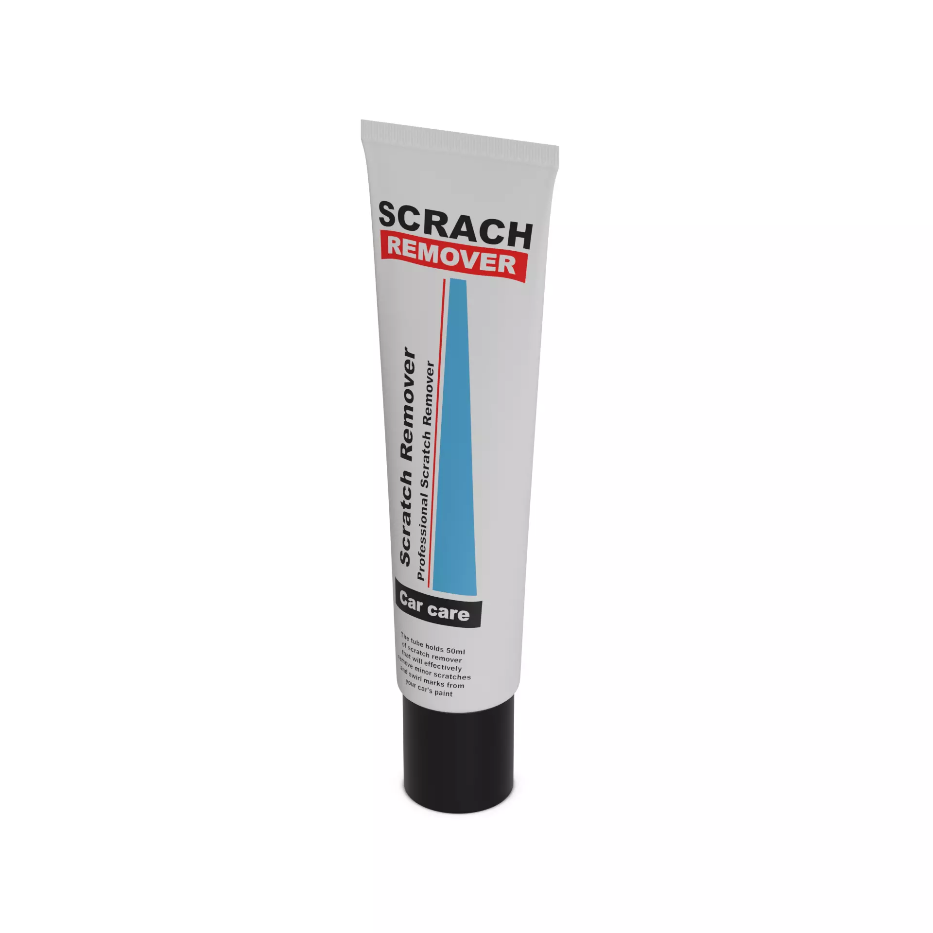 Scratch Remover: A compact, white plastic tube with a precision applicator tip. The tube holds 50ml of scratch remover that will effectively remove minor scratches and swirl marks from your car's paint. The label includes a picture of a car with a flawless paint finish and text that reads Professional Scratch Remover - Restores Your Car's Paint to Perfection.