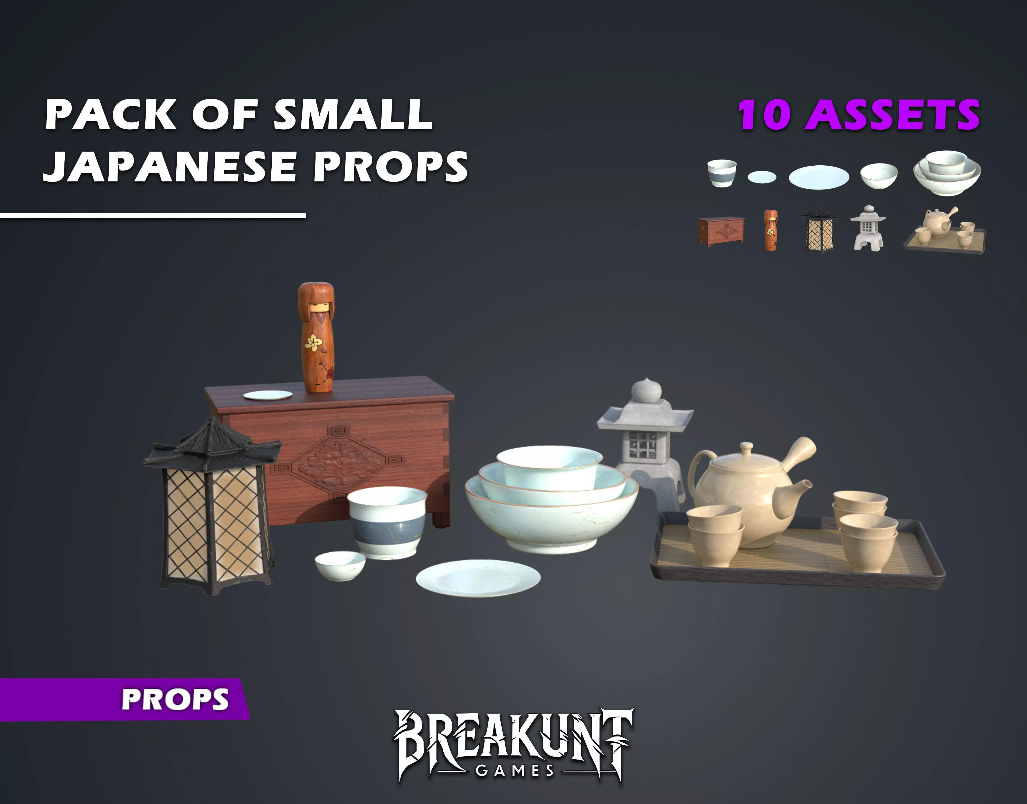 Tags :japanese, japan, asia, asian, tea set, ceramic, bowls, cups, plates, kokeshi, lantern, wood chest, bamboo tray, stone lamp, props, 3d model, low poly, pbr, game asset, traditional, zen, minimalist, culture, oriental, environment prop, kitchen prop, tableware, toy, decoration