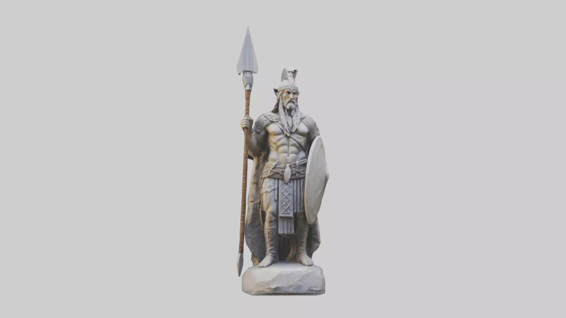 Concise 3D model of a Pagan Warrior statue. Depicts a sculpted figure of a warrior from a pagan culture or historical period. May feature period-specific armor, weaponry (swords, axes, spears, shields), and symbolic elements related to pagan beliefs (runes, totems, animal motifs). Often portrayed with a strong, fierce, or stoic expression. Could represent warriors from various pagan cultures such as Viking, Celtic, Slavic, or ancient Greek/Roman traditions. Suitable for historical visualizations, fantasy art, game development (historical or fantasy settings), and educational purposes related to ancient cultures and mythology. Available in FBX, OBJ, STL, GLB, USDZ, and BLEND formats.