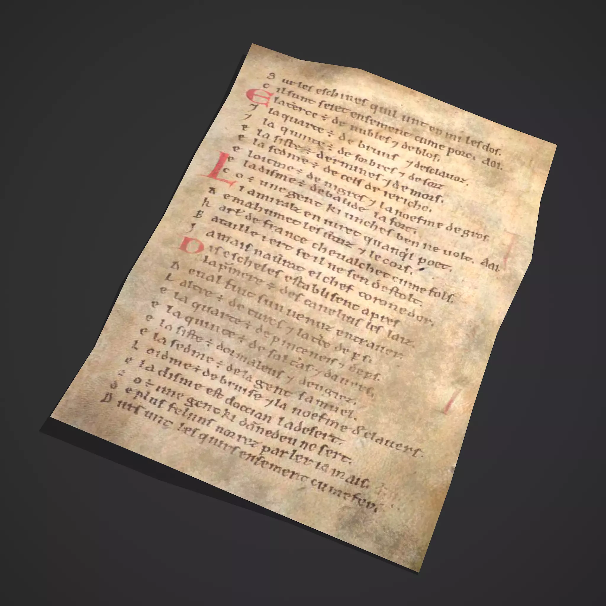 Page of Chanson de Roland -12th Century - The most famous epic of French literature. 3D Model PBR Texture available in 4096 x 4096 Maps include : Basecolor, Normal, Roughness, Height and Metallic. All Preview renders were done Marmoset Toolbag 4 Scaled to real world scale. Customer Service Guaranteed. From the Creators at Get Dead Entertainment. Please like and Rate! Follow us on FaceBook and Instagram to keep updated on all our newest models.