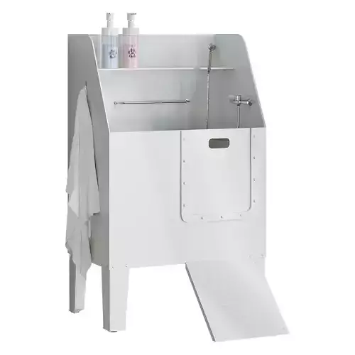 Professional bathroom for grooming and veterinary facilities. Suitable for grooming salons, veterinary clinics, pet salons and animal spas. The structure is equipped with a convenient ramp for the safe entry of animals, a shelf for care products, a towel holder, a towel and a shower head.