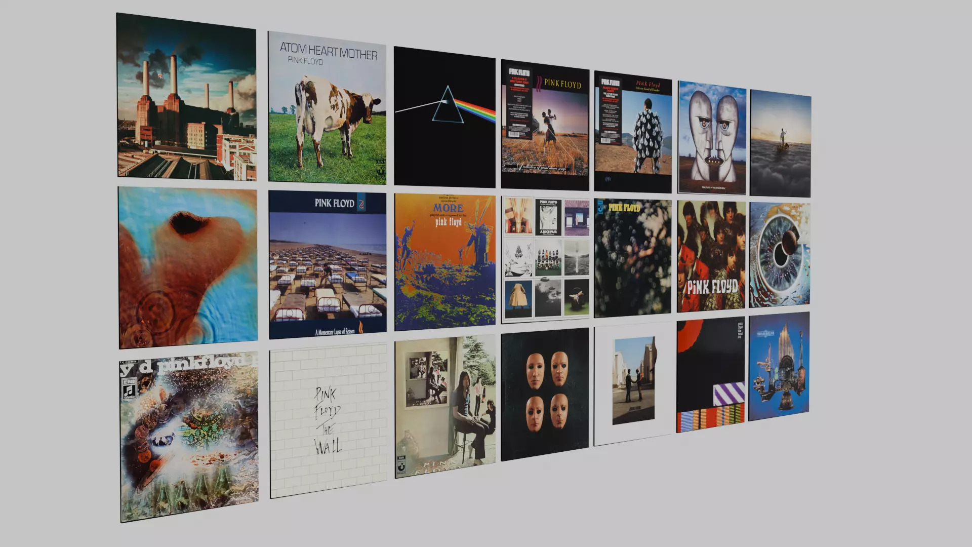 Own the definitive 3D collection of Pink Floyd's iconic discography with this meticulously modeled set of 21 individual album covers. Perfect for populating virtual record stores, adding detail to a fan's bedroom or studio render, or as a stylized asset for games and VR/AR environments.