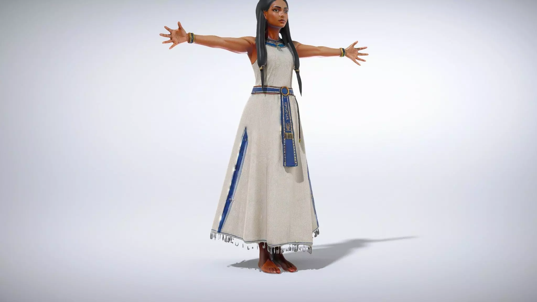 Egyptian Scribe — a poised female scholar with a slender build and long black hair in tight braids adorned with gold beads. She wears a white linen kalasiris edged in cobalt blue and a bronze ankh necklace, with a calm, focused expression. PBR-friendly materials. 4096x4096 textures. Includes three mesh densities: 1k, 10k, and 100k polygons.