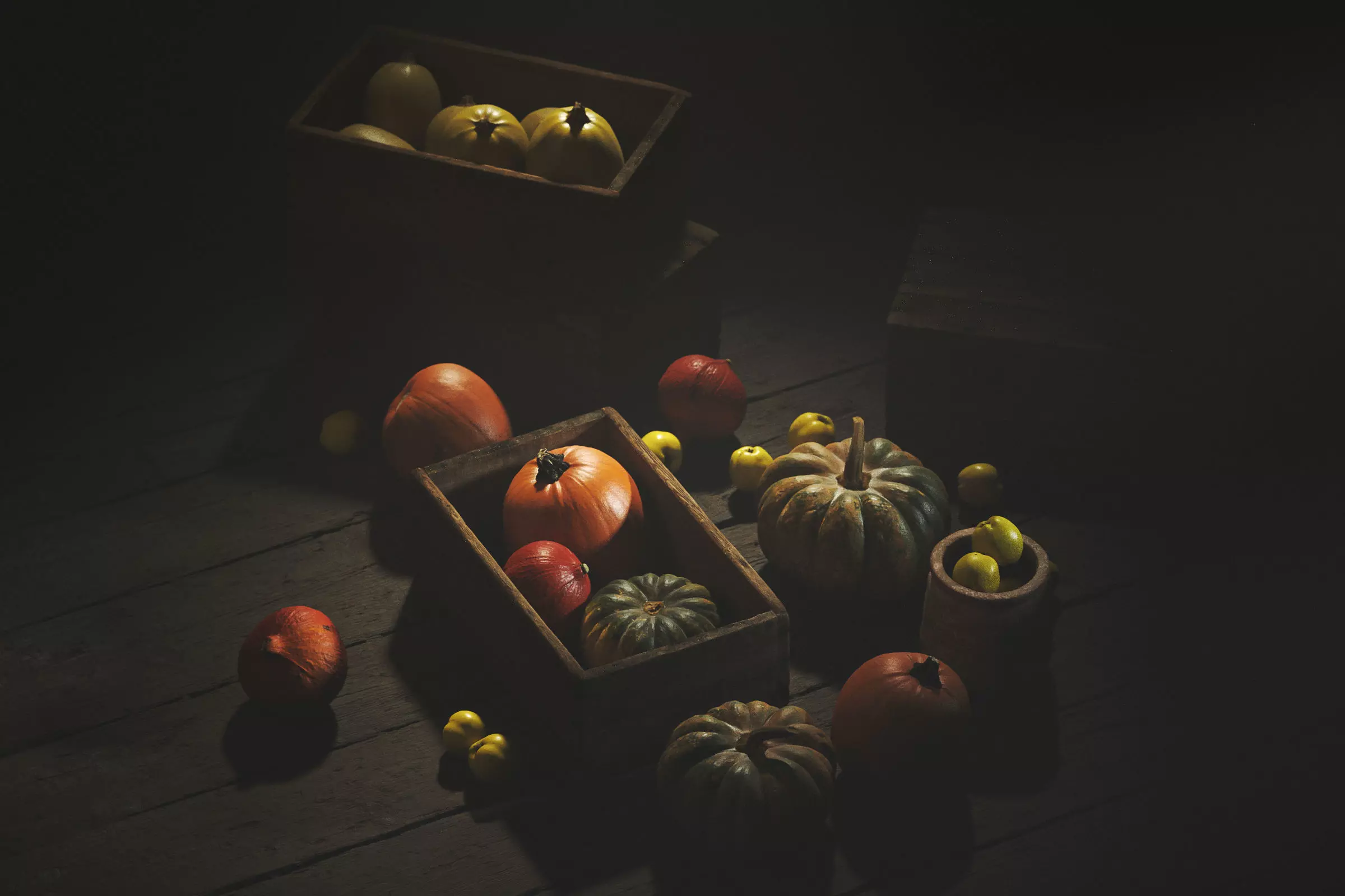 This is our first model set! We have some detailed natural pumpkins, an old wooden box, the clay pot and the quince fruit. Everything as single files (.c4d, .blend). Just drag and drop it in your modelbank and use it in your 3D scenes.