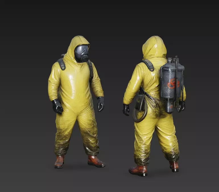 Immersive Detail: Features a realistic gas mask with reflective visor and a weathered chemical backpack unit with hoses.