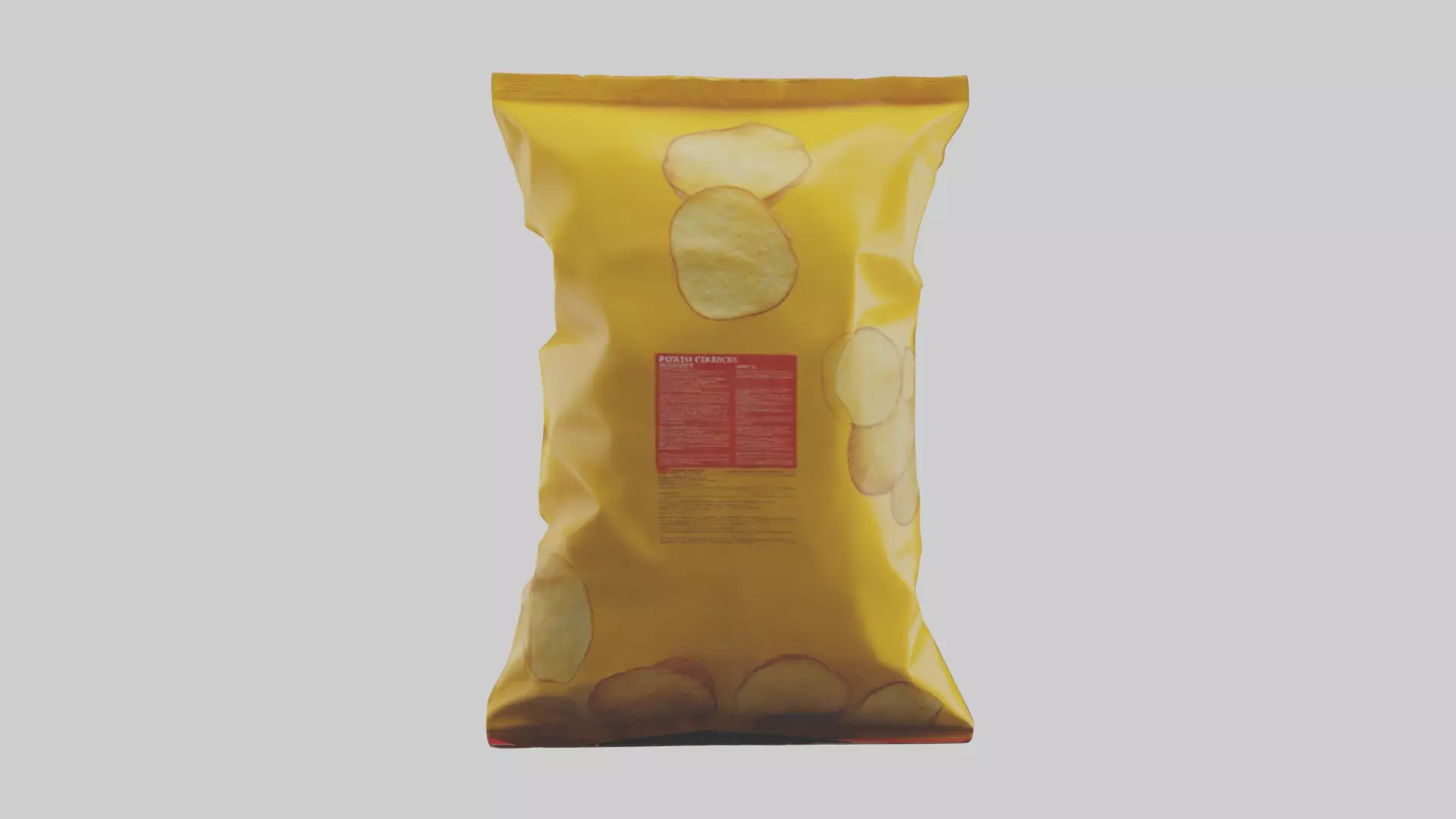 [3D model, patates cipsi, atıştırmalık poşeti, oyun varlığı, ürün görselleştirme, animasyon, gıda ambalajı]