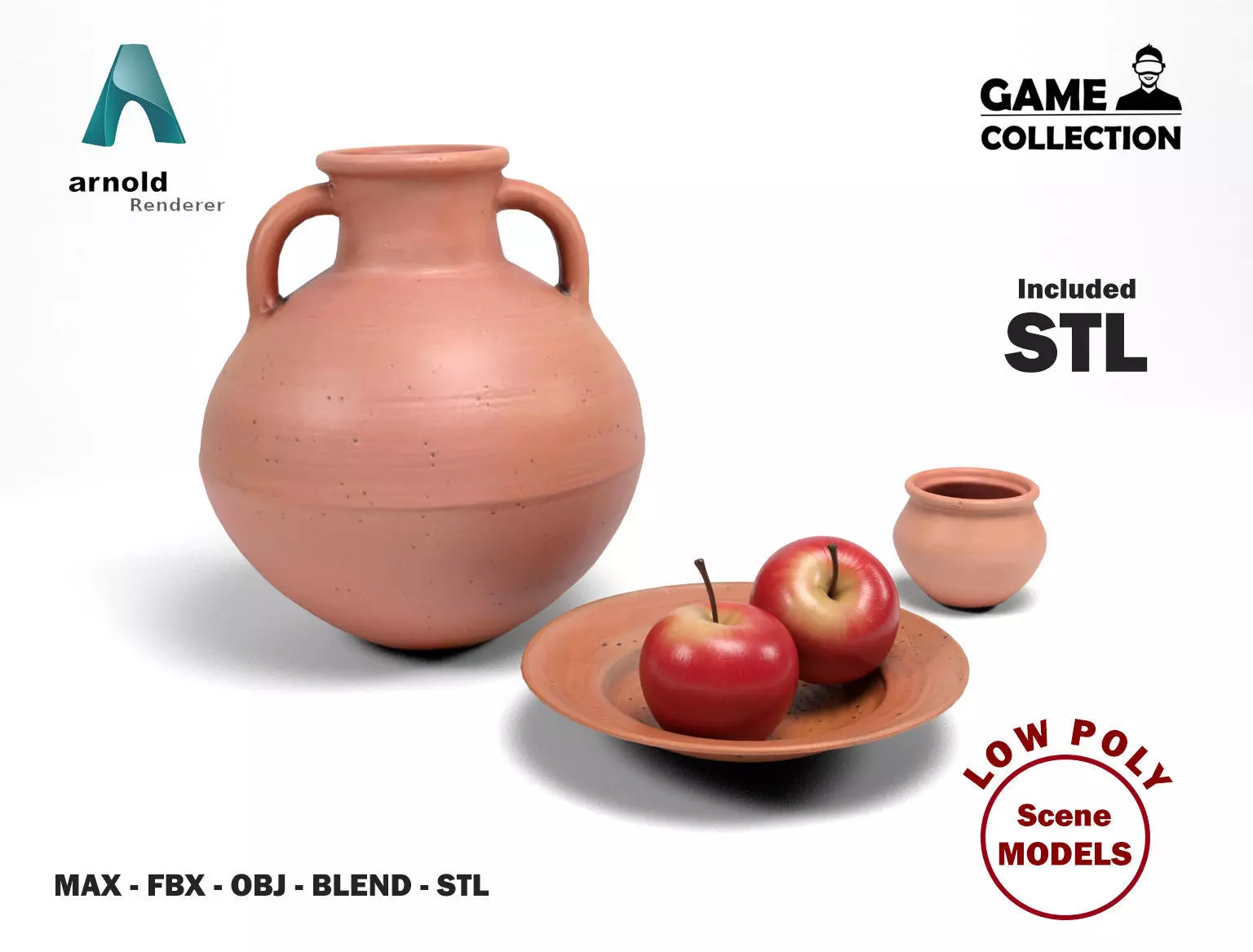 3D Pottery pack, apples are included. All the models are low poly, basic but realistic and are ideal for 3D scenes that require few polygons. They can be used for advertising visualitations and also for games or applications. It has been created in different 3D Studio Max versions and also in FBX, OBJ, STL and blend.