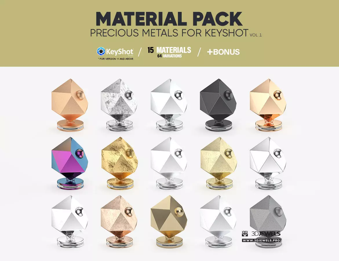 Download the free brochure: https://3djewels.pro/materials/material-library/precious-metal-material-pack-for-keyshot-rendering#brochure